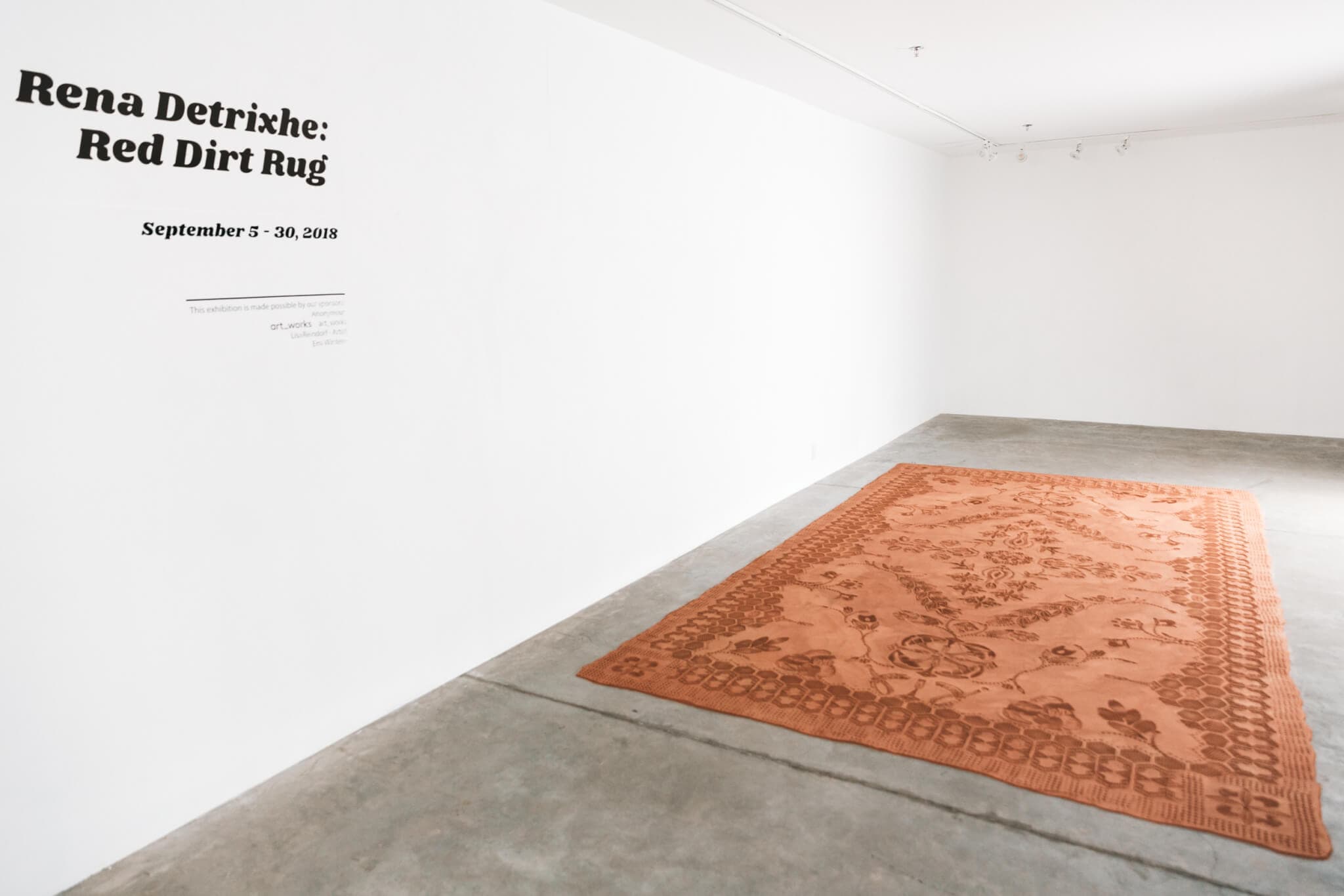 Rena Detrixhe, “Red Dirt Rug,” installation view, Abigail Ogilvey Gallery, Boston, September 5–30, 2018. Photo courtesy of Abigail Ogilvy Gallery.