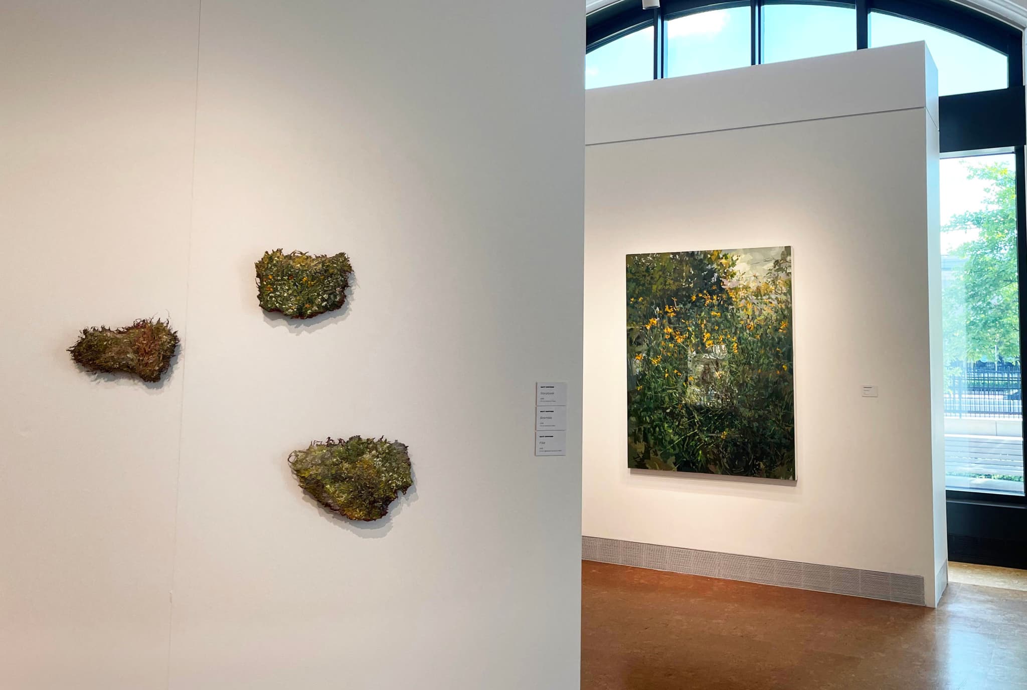 Installation view of “Field Visions,” Boston University Art Galleries, June 14–September 14, 2022. From left to right: Matt Hufford, Storybook, 2018, Bramble, 2018, and Filet, 2018; Stephanie Pierce, Cosmos, 2013. Photo by BAR staff.