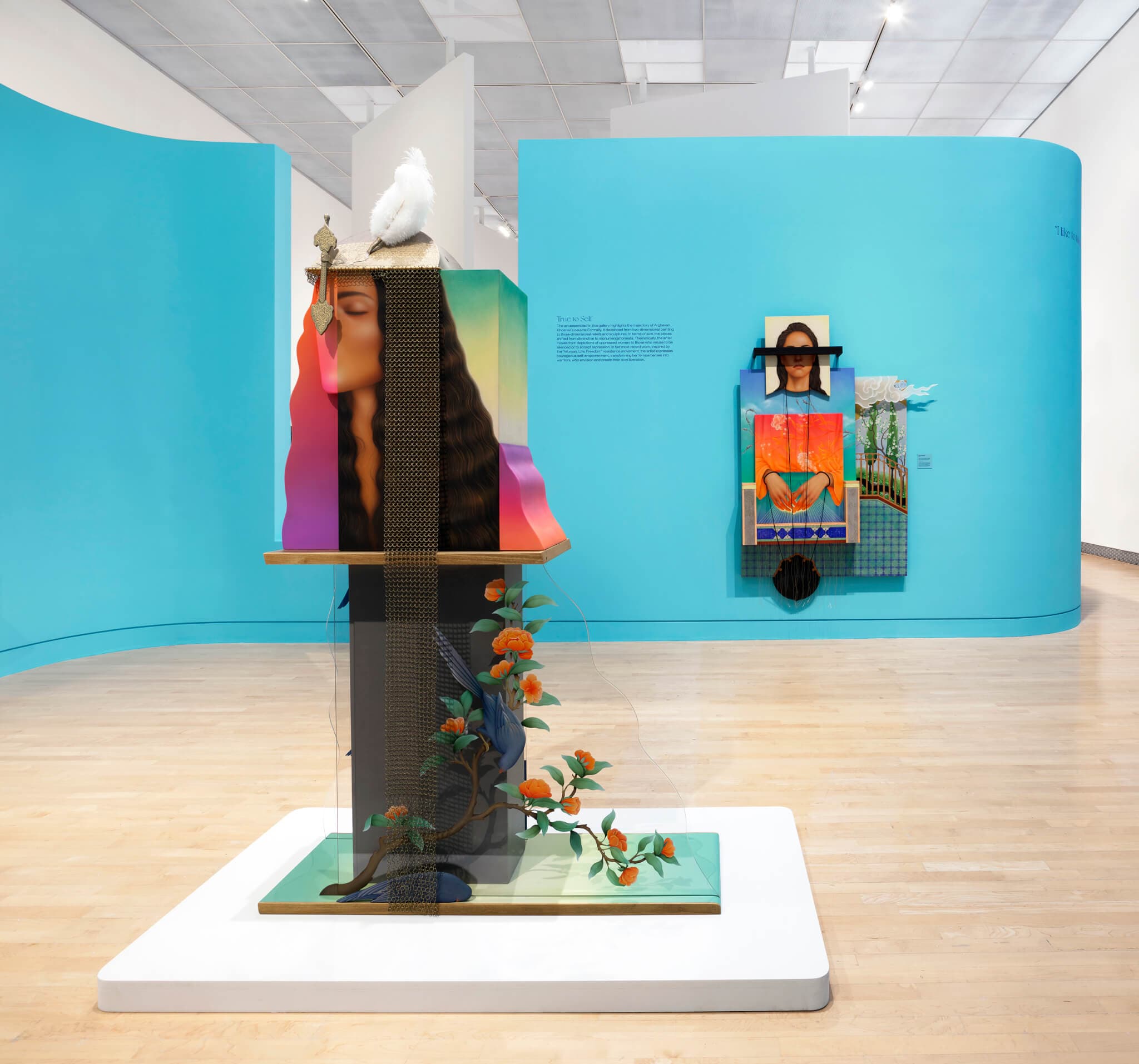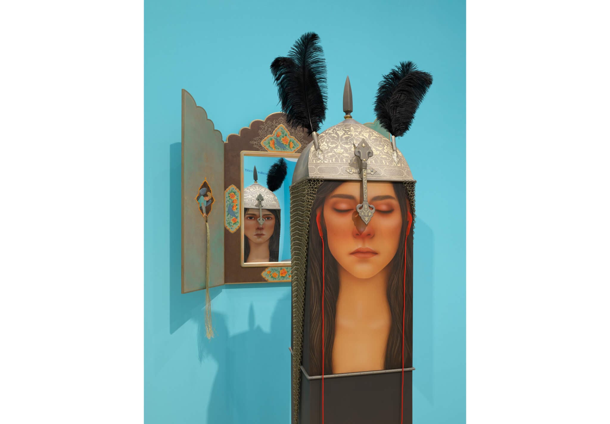 Installation view of “Arghavan Khosravi: Black Rain,” on view at the Rose Art Museum, Brandeis University from August 3–October 22, 2023. (pictured) True to Self, 2023. Acrylic on canvas and textile over wood panels, feather, chainmail, elastic cord, mirror, thread, 83″ x 5″1 x 36″ (HWD). Photo by Julia Featheringill Photography. Photo courtesy Rose Art Museum.