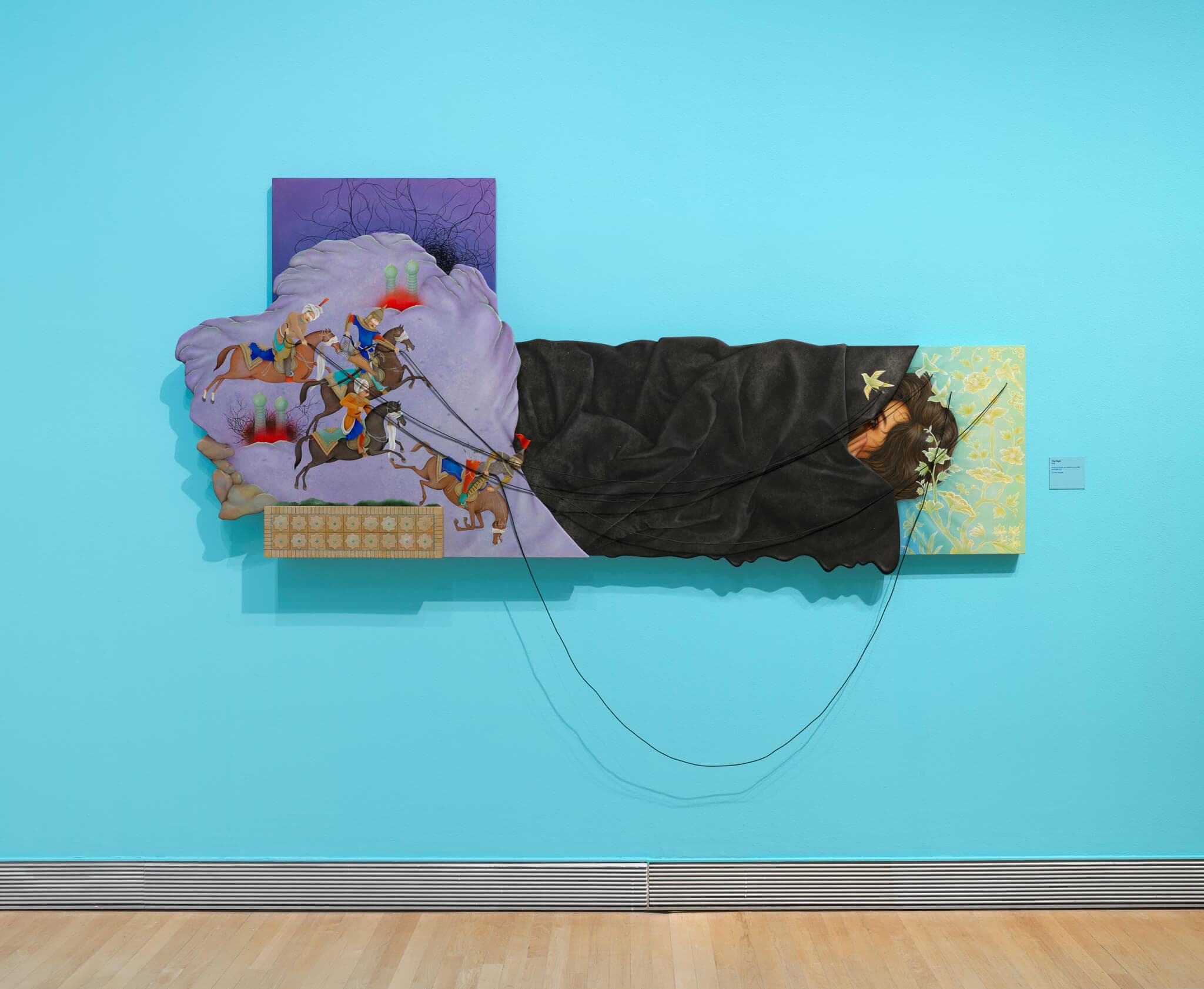 Installation view of “Arghavan Khosravi: Black Rain,” on view at the Rose Art Museum, Brandeis University from August 3–October 22, 2023. (pictured) The Flight, 2023. Acrylic on canvas over shaped wood panels, elastic cord. 49″ x 97.5″ x 5″. Photo by Julia Featheringill Photography. Photo courtesy Rose Art Museum.