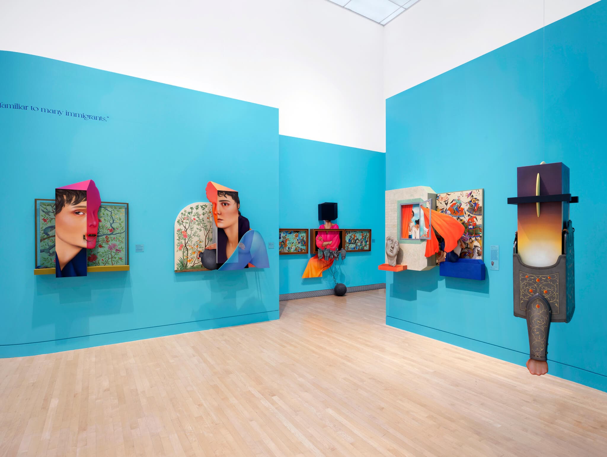 The face of a woman emerges as part of a sculpture in the center of a room, set in front of blue and green walls.