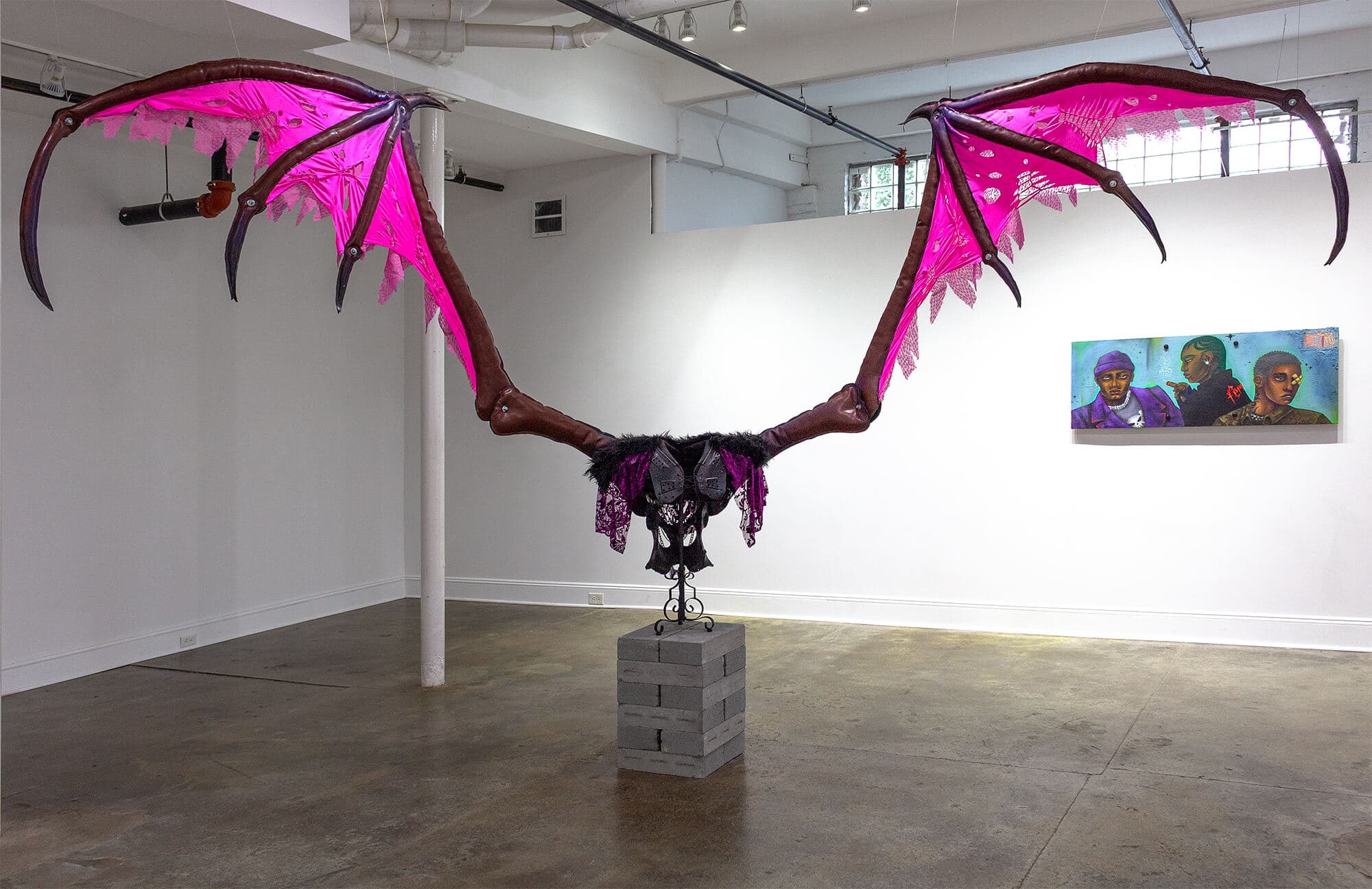 In “Black Cherry Dreams,” Rixy continues building the surreal world of Cúcala—where club aesthetics, Caribbean iconography, and street ephemera converge in vibrant, layered storytelling. Through paintings, sculptures, and found-object assemblage, Rixy reflects on dreams, death, and diasporic memory. Many of the works on view in the Dorchester gallery were also on view as part of Rixy’s solo exhibition at Essex Art Center in Lawrence last December where pieces like Them Rowdyruff Boyz and Too Fast and Too Furious toyed with masculinity, glamor, and grit. Born from materials like faux fur, tire scraps, and plátano boxes, the pieces honor the lived texture of places like Roxbury, Lawrence, and Lynn. “Black Cherry Dreams” is both fantasy and autobiography—an altar to the beauty growing from concrete, and an invitation to linger in the shadows of joy, resistance, and becoming. —Jameson Johnson