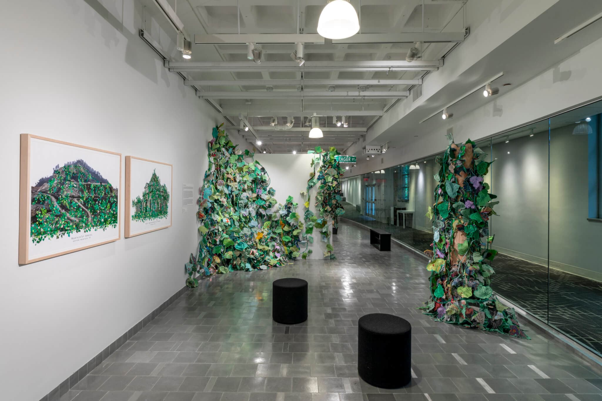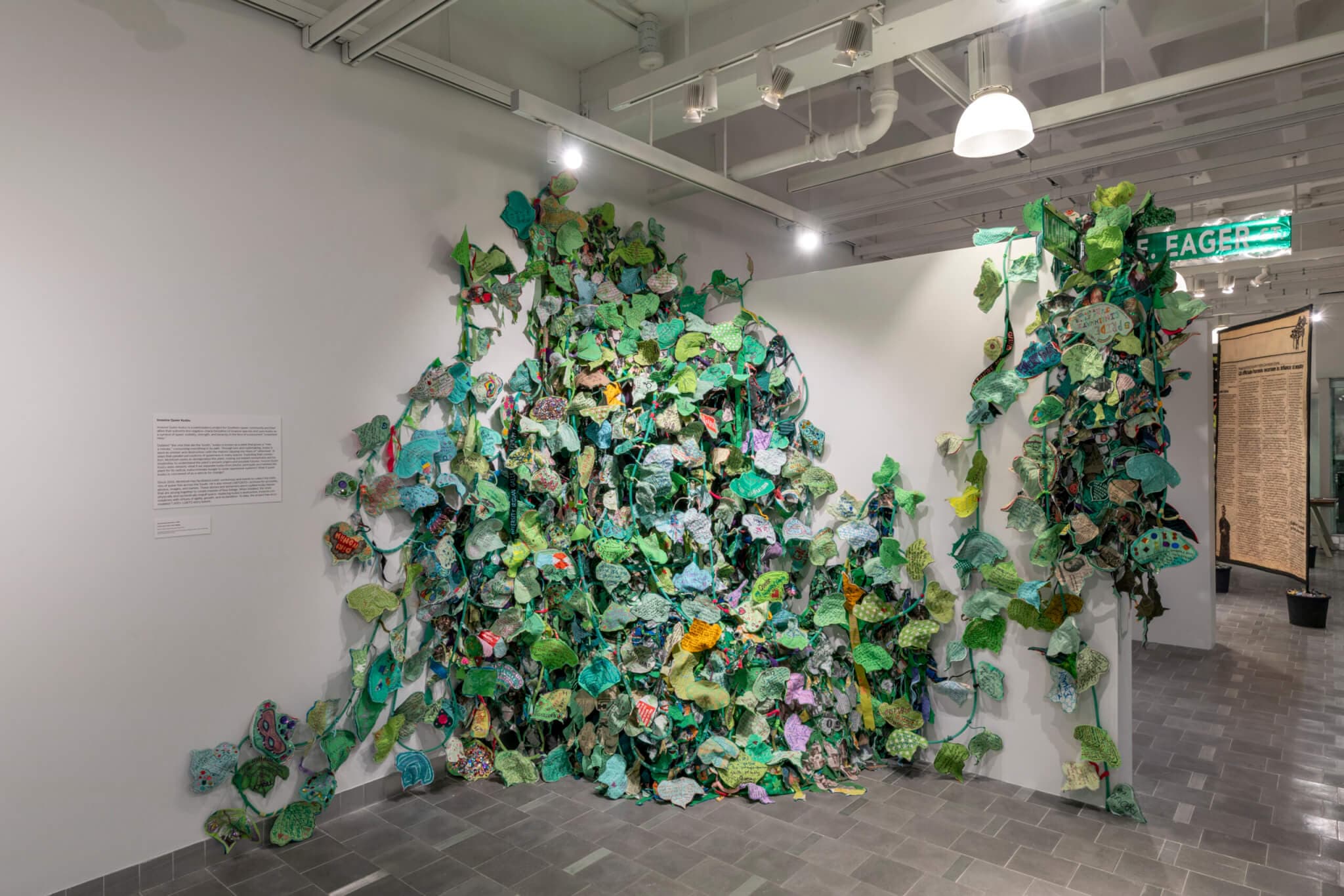 Installation view of “Entanglements” at Northeastern University’s Gallery 360, Boston, 2023. Aaron McIntosh, Invasive Queer Kudzu, 2015–ongoing. Mixed-media sculpture and queer kudzu vines. Courtesy of the artist. Photo by Mel Taing.