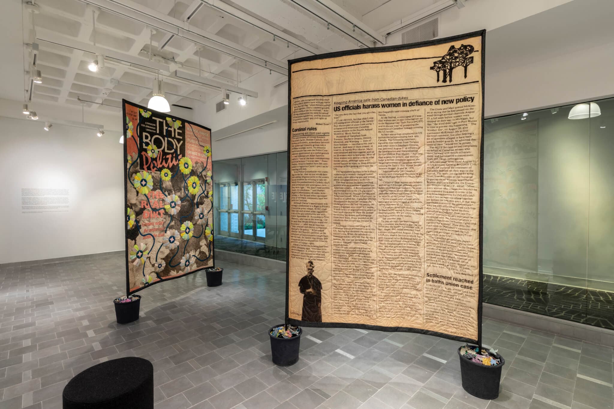 Installation view of “Entanglements” at Northeastern University’s Gallery 360, Boston, 2023. (left) Aaron McIntosh, Entanglements: Dying to Live / The Real Dirt, 2023. Digital textile print on muslin, vintage fabrics, thread. (right) Aaron McIntosh, Flowers at the Border / Keeping Safe, 2022. Digital textile print on muslin, vintage fabrics, thread. Courtesy of the artist. Photo by Mel Taing.