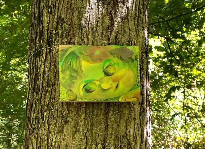 Visitors comfortable with the demands of a mile-ish uphill hike on uneven terrain can walk three interconnecting trails, where canvases hang on trees and sculptures are found atop decaying stumps, placed on beds of leaves, or stashed in mossy crevices. You don’t have to hunt for these objects. They’re installed at semi-regular intervals and accompanied by a hand-painted sign bearing a number that corresponds to an identifying entry in the exhibition takeaway. The two-sided Xerox sheet features Mundus Press’s signature pastiche of multiple typefaces and naïve hand-drawn lettering and doodles layered over found imagery (see also their distinctive screen-printed merch).