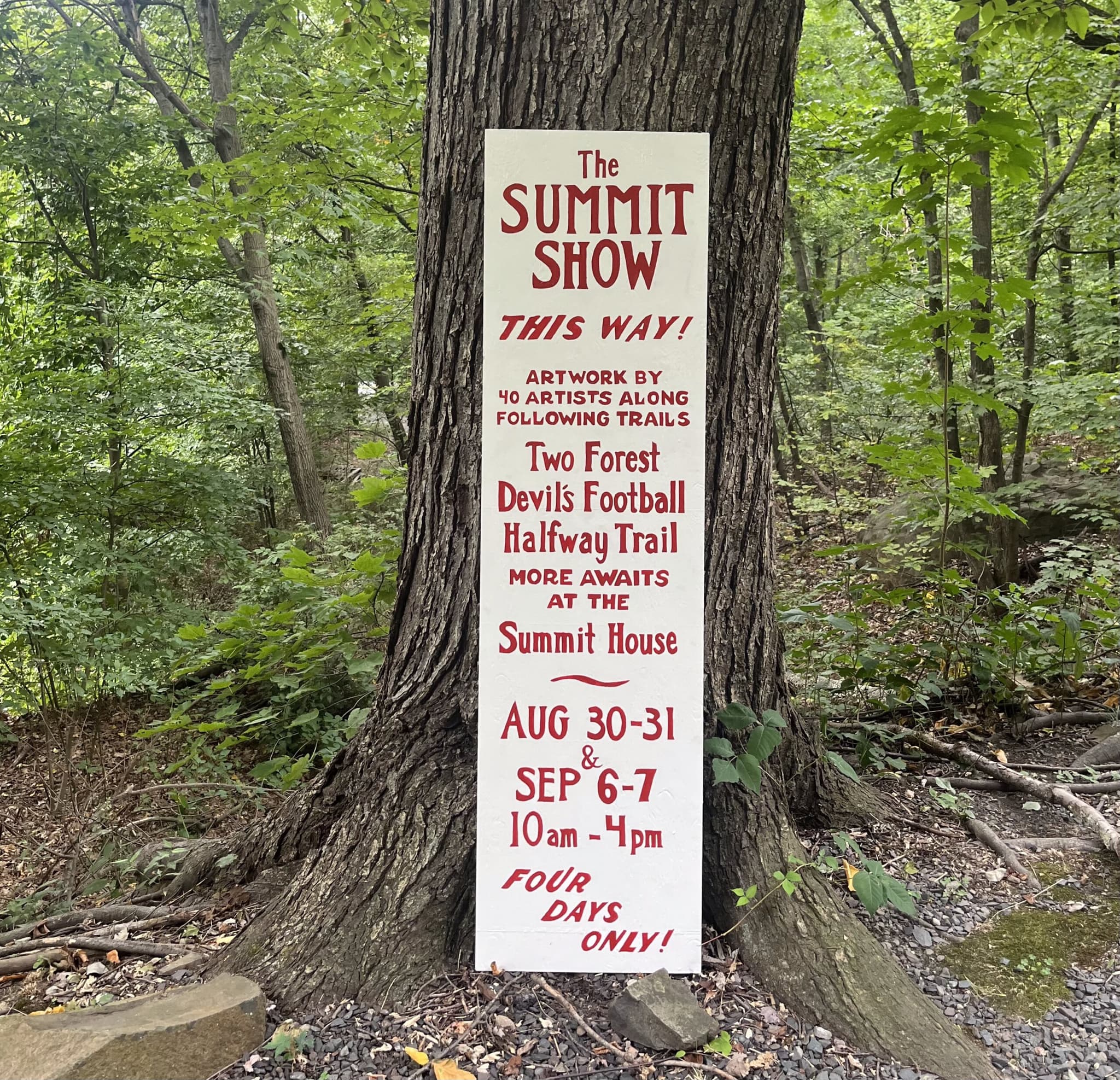 For two consecutive weekends at Skinner State Park in Hadley, outdoorsy types can take in a contemporary art exhibition on an incline. “The Summit Show” features works by more than forty artists mostly based between the Berkshires and New York City. Curated Charlotte Kohlmann, co-founder of Mundus Press, the outdoor exhibition is inspired by the Mount Holyoke landscape and its history. “The Summit Show” builds on the concept of their 2021 “The Swamp Show,” a memorable presentation where works installed in an algae-covered inlet of the Connecticut River were accessible by canoe and performances took place on a floating raft. Four years apart, the unruly and fun pair of presentations map onto two opposing perspectives—the worm’s eye and the bird’s eye, respectively— of the u-shaped, “Oxbow” bend where the Connecticut River loops around itself in Northampton.