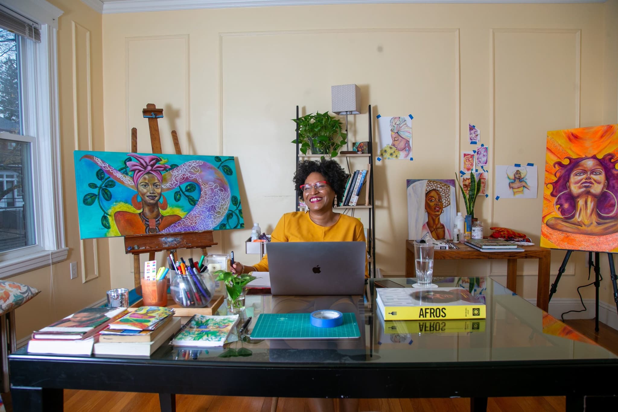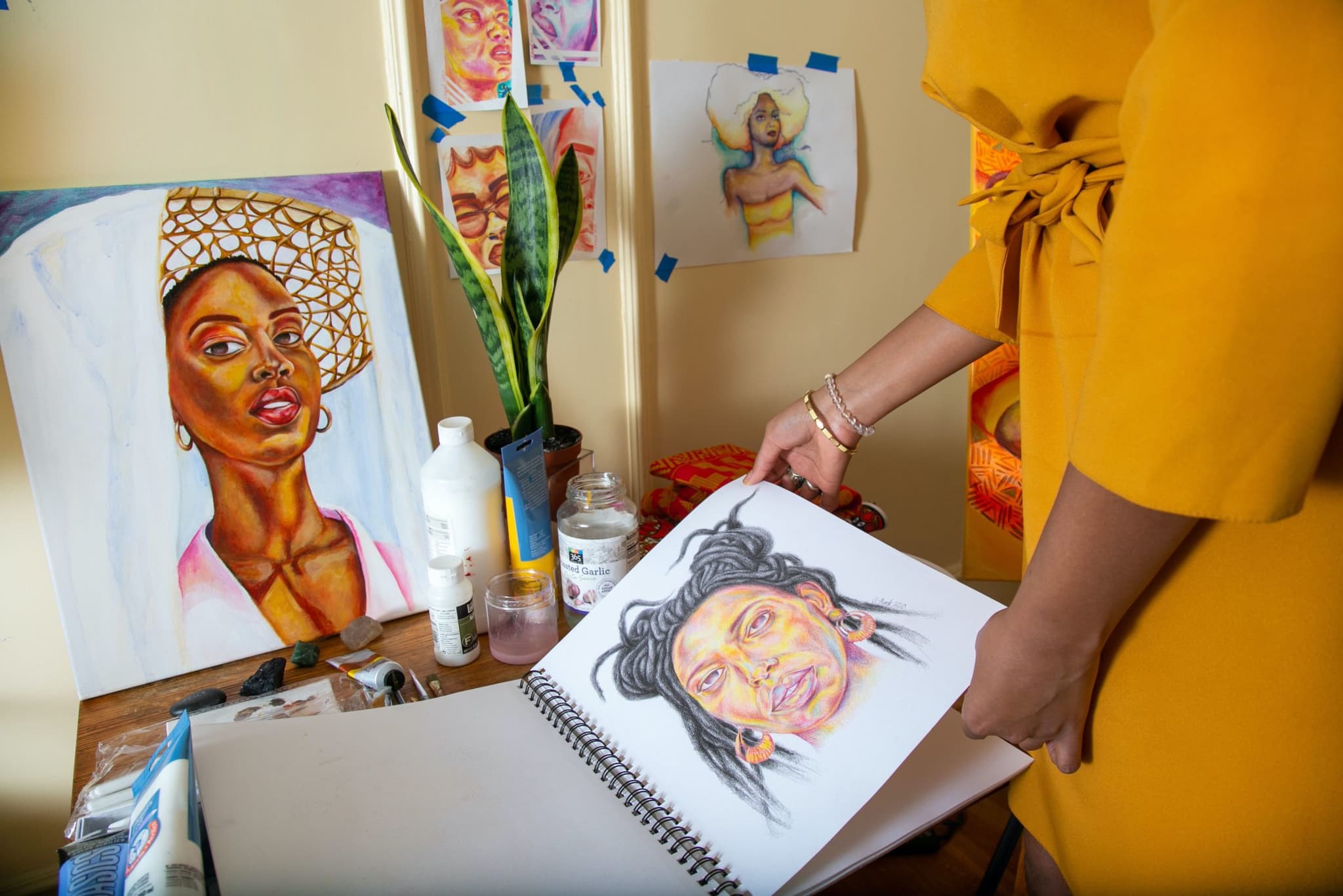 Ayana Mack is at her home studio, seated beside two paintings of women's faces, while a collection of artwork appears on the wall to the right.