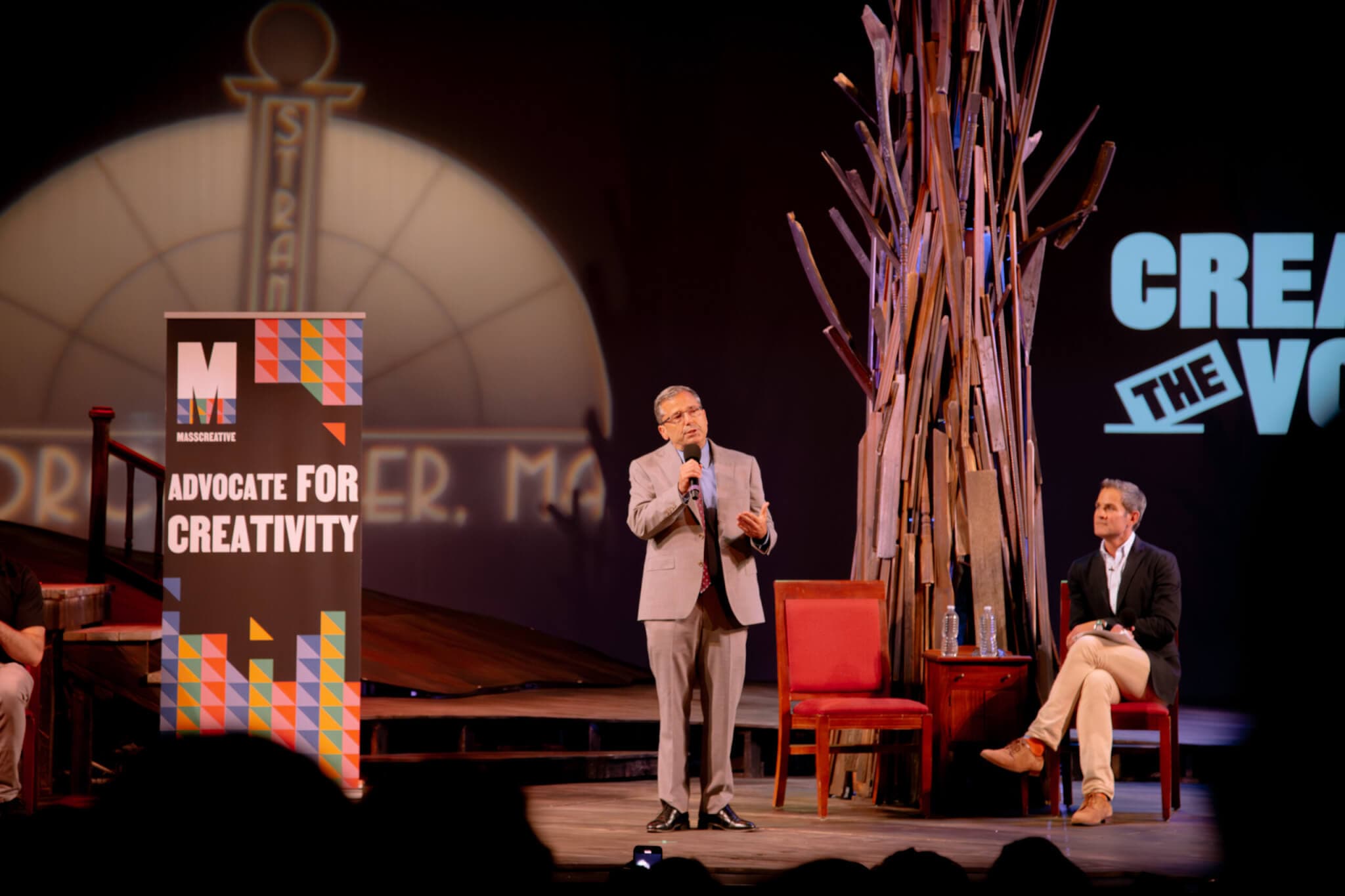 In kicking off the event, MASSCreative’s executive director, Emily Ruddock, thanked attendees for showing up to have their voices heard at such a moment. “This is how we build political power,” she said. “This is how we make sure that everyone has access to vibrant arts and cultural experiences.”