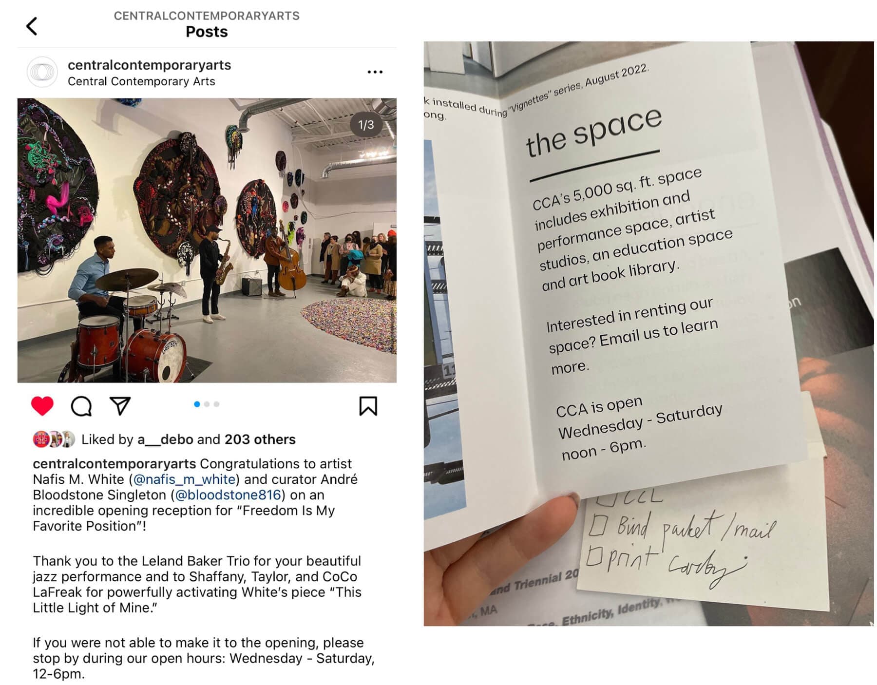 (left) This screenshot of a CCA Instagram post advertising “Nafis M. White: Freedom Is My Favorite Position,” originally posted on February 8, 2023, highlights the original hours. (right) A photograph of the printed pamphlet that was available at the front desk at CCA when I visited March 1, 2023, also lists the original hours.