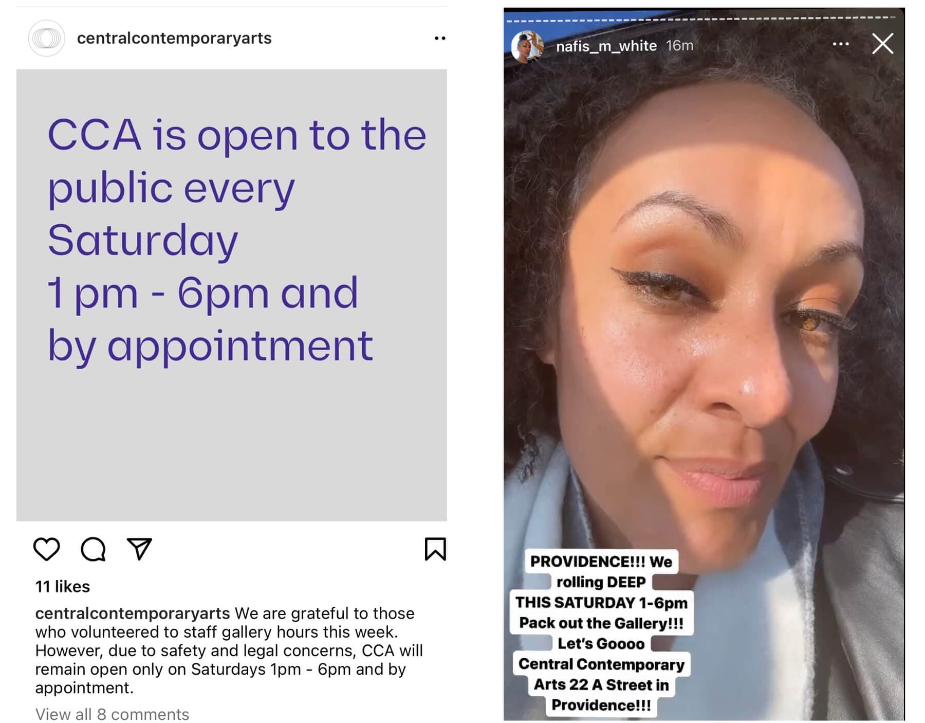 (left) CCA’s second public statement post to Instagram from March 14, 2023 reiterates the gallery’s hours. (right) White calling for attendees to fill the CCA space on the closing date of her exhibition.