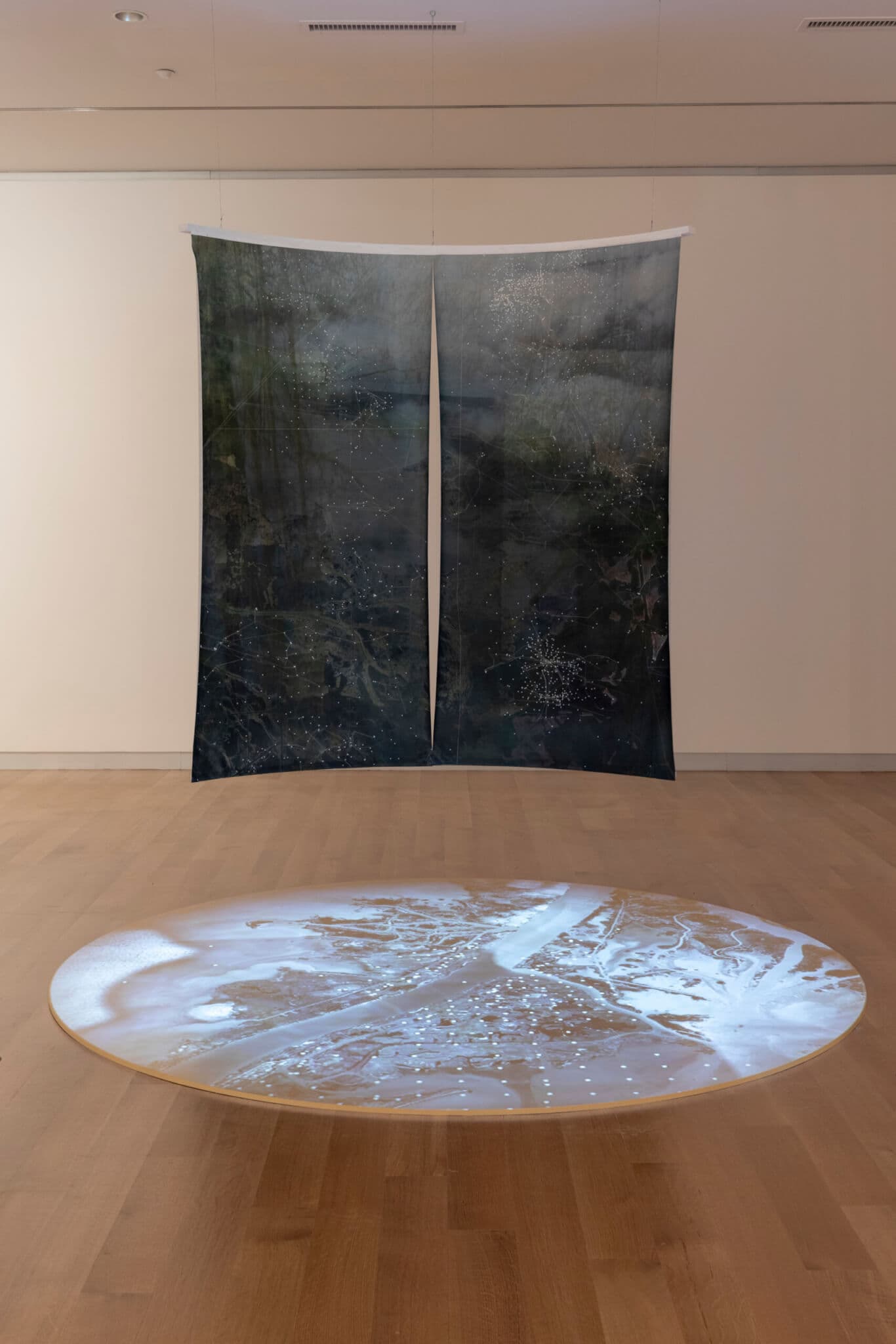 Brown’s work makes research and the awareness of how power and resources correlate beautiful. The kaleidoscopic shifting layers of projected imagery on a circular screen on the floor and two delicate hanging panels are evocative and intricate, but they and the soundscape are not readily legible from the viewer’s vantage point in this gallery. More space and a darker setting might have facilitated more of a synthesis between the imagery and the meaning. The project’s accompanying website bridges the gap between aesthetics and content, clarifying its powerful premise. Brown’s artist-activist research uses maps and up-to-date data to show the precise location of oil wells and pipelines in Louisiana. An aerial view of Louisiana and the Gulf of Mexico shares in detail, with satellite technology and analysis of shoreline surveys, how to tell which companies to hold accountable for massive land erosion and other environmental outfalls from oil production.