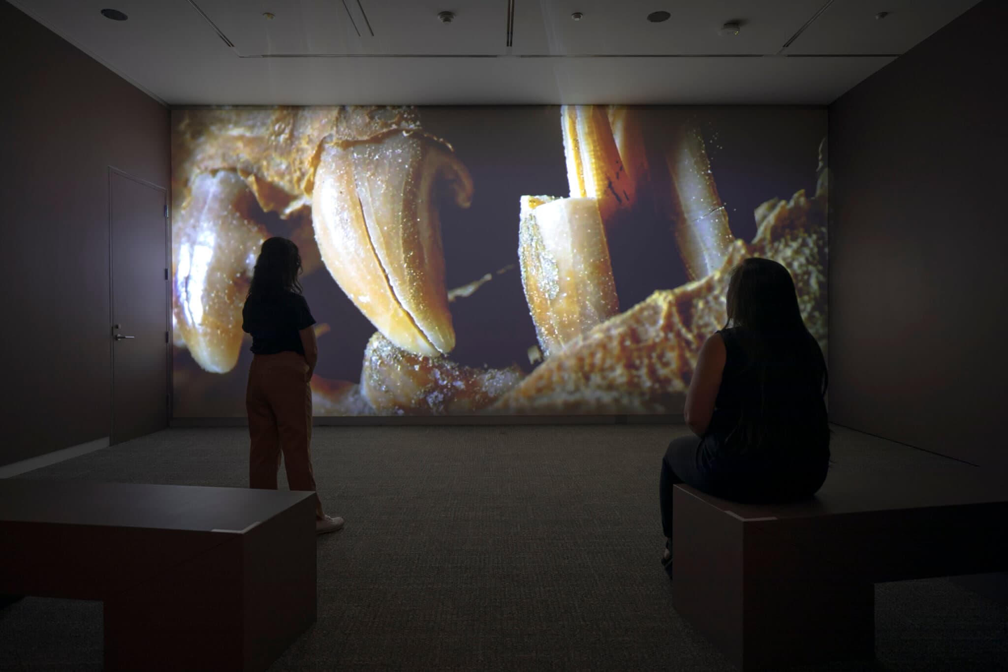 In a cave-like setting, the camera moves in close proximity to its body while the audio accentuates the sensation of immersion with deep whooshing sounds. Fur, amber, and crystals dusted with white dirt come into view. For much of the video, what we see is not discernable. A big moment of recognition is a sharp tooth, like that of a saber-toothed tiger. The visuals are mostly in soft focus with shifting cadences, some moments sharpening into focus. Humans tend to categorize, assuming we understand the totality of the things we assess. My students and I appreciated how the hovering, shifting views of Zhùr withhold visual agency to comprehend the entirety of what is being examined. Watanabe’s choice to not offer the totality of the ancient wolf’s body lets it retain its own autonomy; this mystery prevents us from fully consuming it and moving on.
