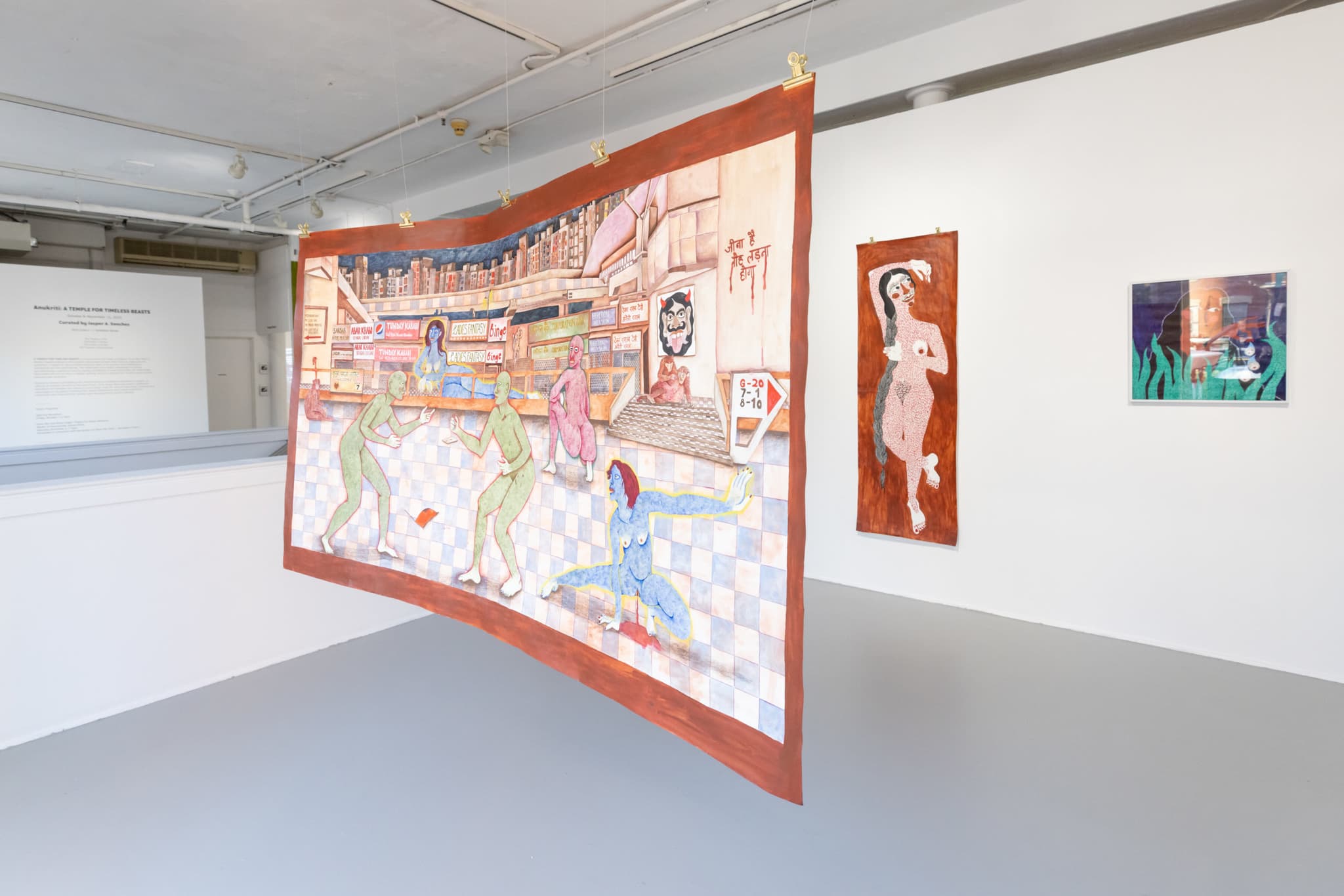 In “A Temple for Timeless Beasts,” artist Anukriti and curator Jasper A. Sanchez forge sacred paths of queer spirituality. The transdisciplinary exhibition blends painting, video, sculpture, and poetry. Anukriti, drawing upon their Hindu upbringing, conjures new visions of divine iconography—androgynous, hairy, curvaceous, and invigorated deities (and/or “beasts”). Sanchez’s curatorial work grounds the exhibition in queer theory, rendering it accessible and emotionally impactful. An installed church pew invites reflection and communion—visitors can spend time reading The Book of Being, a collection of poems curated by Anukriti and Sanchez, available for purchase.