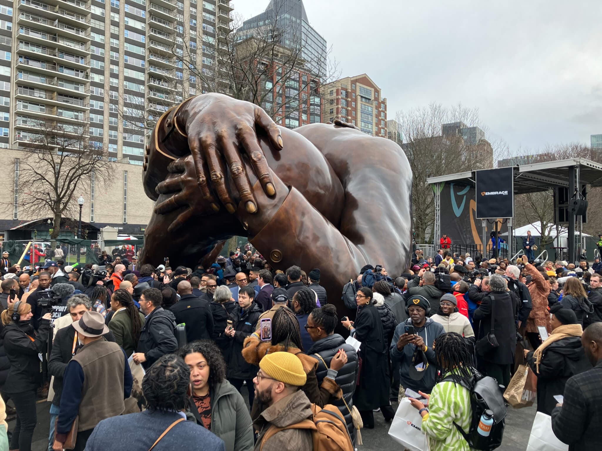 On Friday, January 13, a memorial to Rev. Dr. Martin Luther King Jr. and Coretta Scott King was unveiled on Boston Common, our nation’s oldest public park. The two-story bronze sculpture depicts two sets of disembodied arms wrapped around one another in, well, an embrace. The 3D rendering created by artist Hank Willis Thomas and MASS Design Group was inspired by a photo of the Kings sharing a hug after learning Dr. King had won the Nobel Peace Prize in 1964. For Bostonians, the sculpture is a homecoming of sorts, one that calls attention to the love between Coretta and Dr. King that was sparked here in Boston and reverberated around the world.