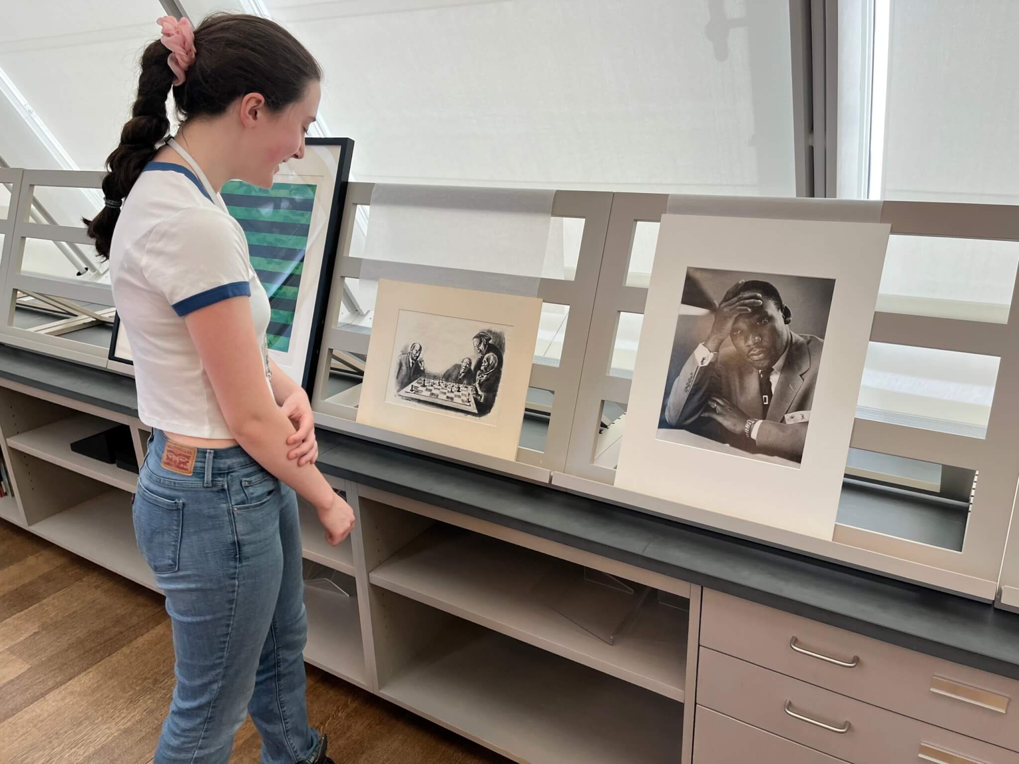Hannah Gadway selecting items in the Art Study Center at Harvard Art Museums. Photo by Laura Muir.