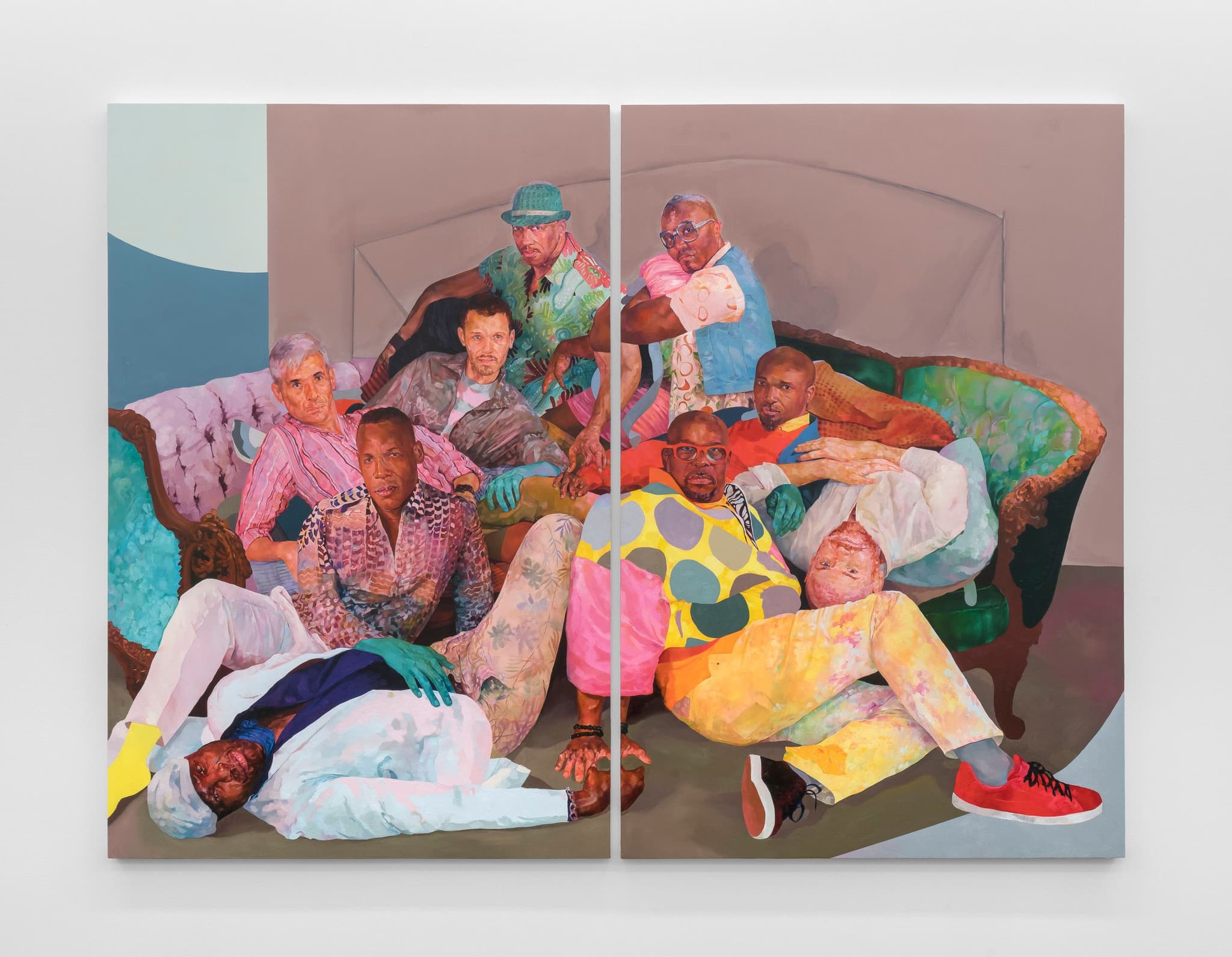 David Antonio Cruz, canyoustaywithmetonight_causeyouarehere,youarehere,andweareherewithyou, 2021. Oil and latex on wood panels, 72 × 96 inches (182.9 ×243.8 cm) (overall). Courtesy the artist and Monique Meloche Gallery, Chicago. © David Antonio Cruz