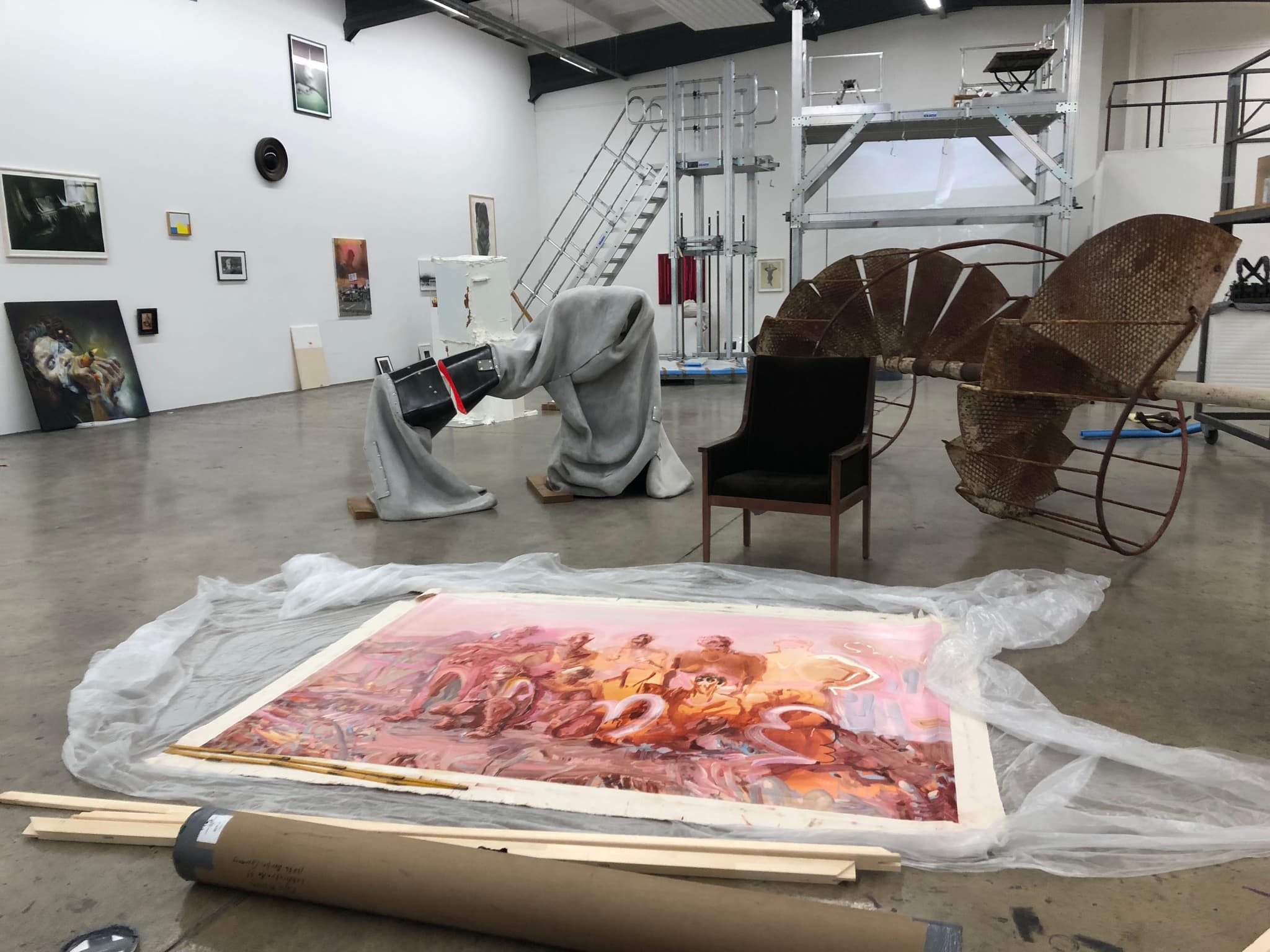 On floor: Manning’s work on loan from the McAllister Collection, re-stretched at Jonas Burgert’s studio in Berlin April 2018.