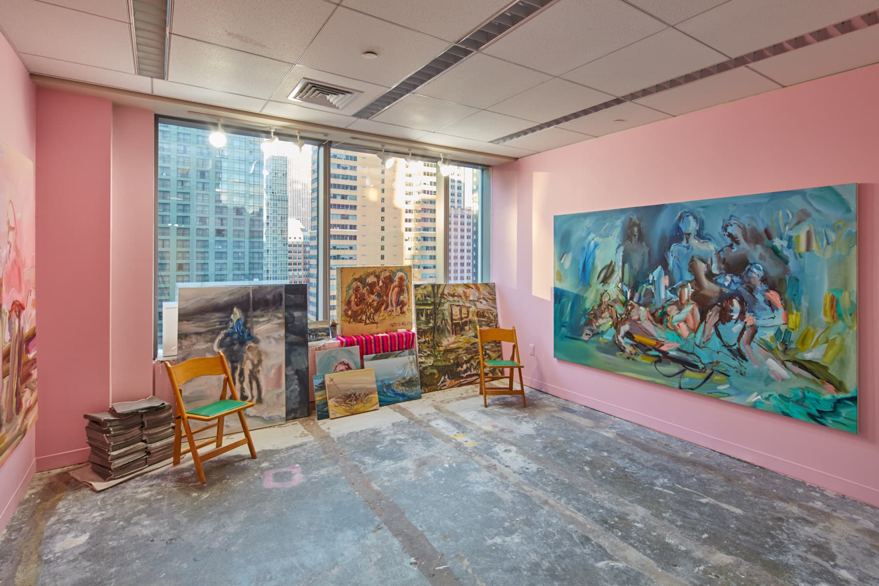 From these silly, wonky figurative landscapes I began to play with humor and gravity, developing paintings with a bit more consciousness. Being around so many great male painters, I also was able to further dismantle the idea of masterpieces being associated with males through working in a massive scale.