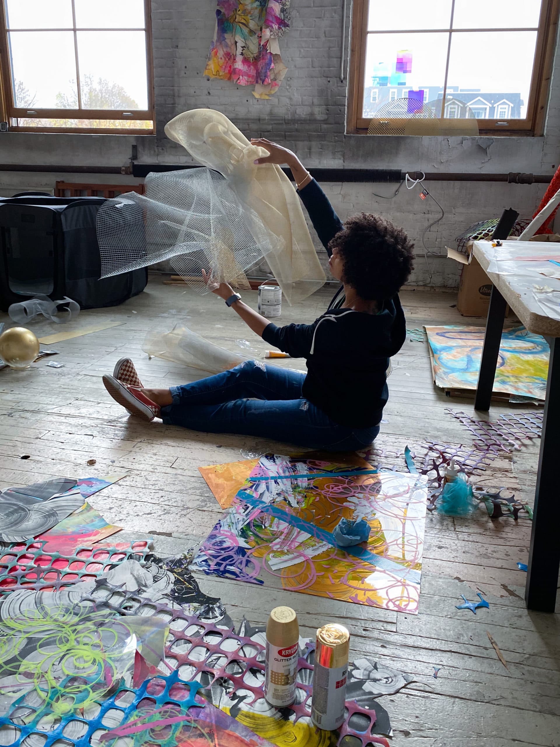 CC: Take Unbound. This one was an exercise in exploring boundaries, so I incorporated emergency netting. As a material, it represents safety, protection, and the containment of imprisoned people, such as the children separated from their parents at the United States-Mexico border and those living within the prison-industrial complex. In government propaganda, we are told that people in cages are guilty of something terrible, even if innocent, and not worthy of redemption. But when is a child not worthy of love? In this painting, I wanted to burn down barriers metaphorically to let whoever is in cages know they’re not forgotten.