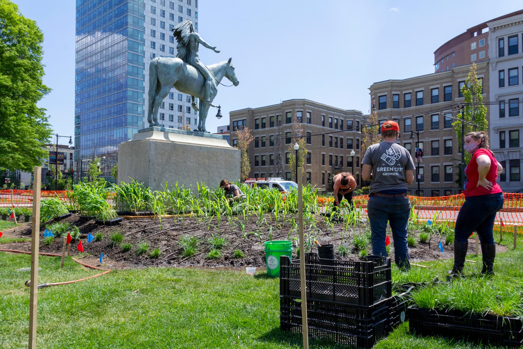 Elizabeth James-Perry and her team planted a Three Sisters garden around Cyrus Dallin’s Appeal to the Great Spirit for Raven Reshapes Boston: A Native Corn Garden. Photo © Museum of Fine Arts, Boston.