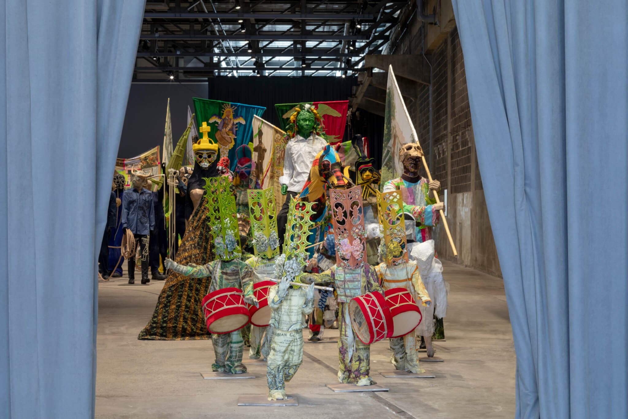 Installation view, “Hew Locke: The Procession,” the Institute of Contemporary Art / Boston, 2024. Photo by Mel Taing.