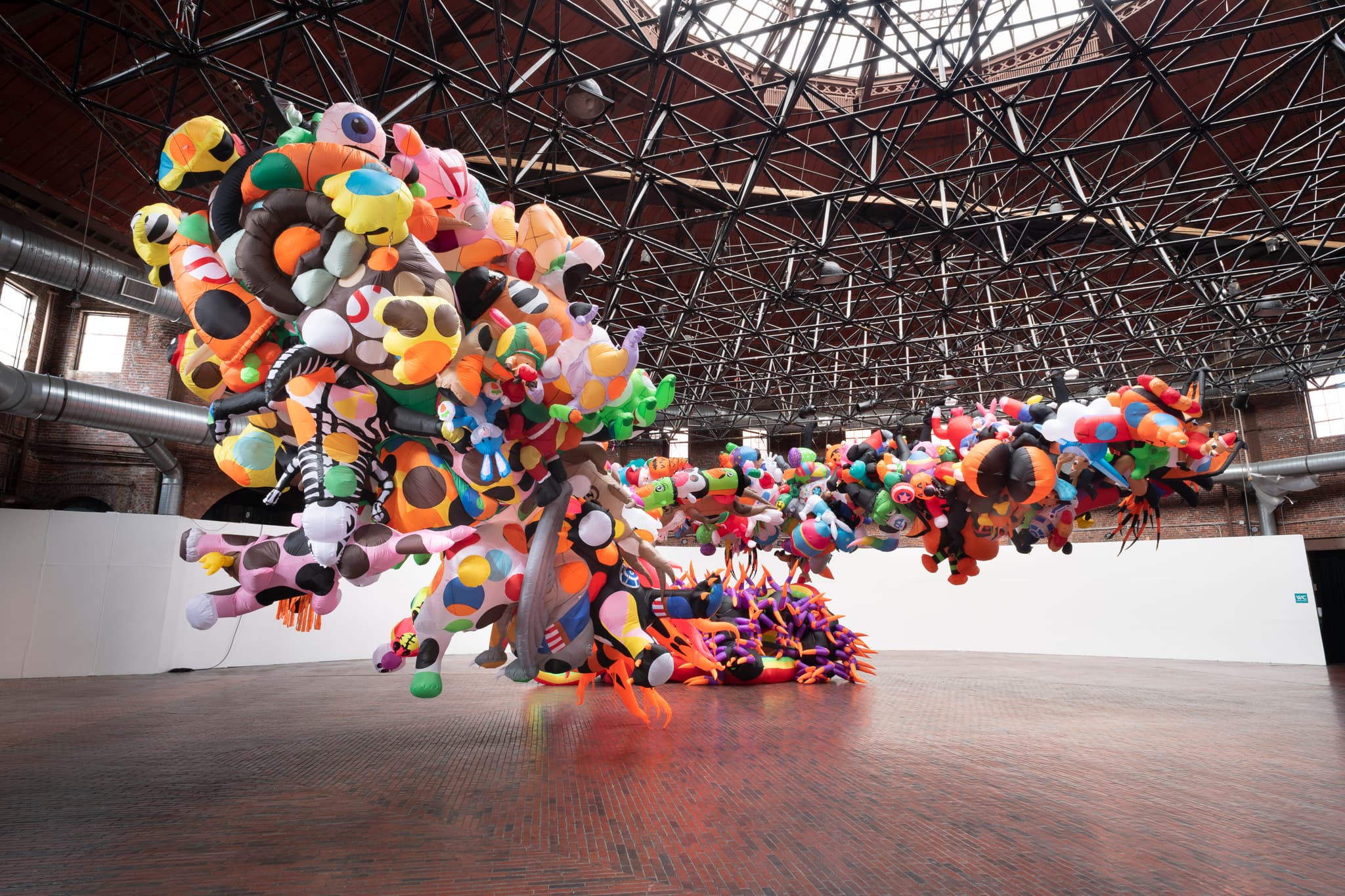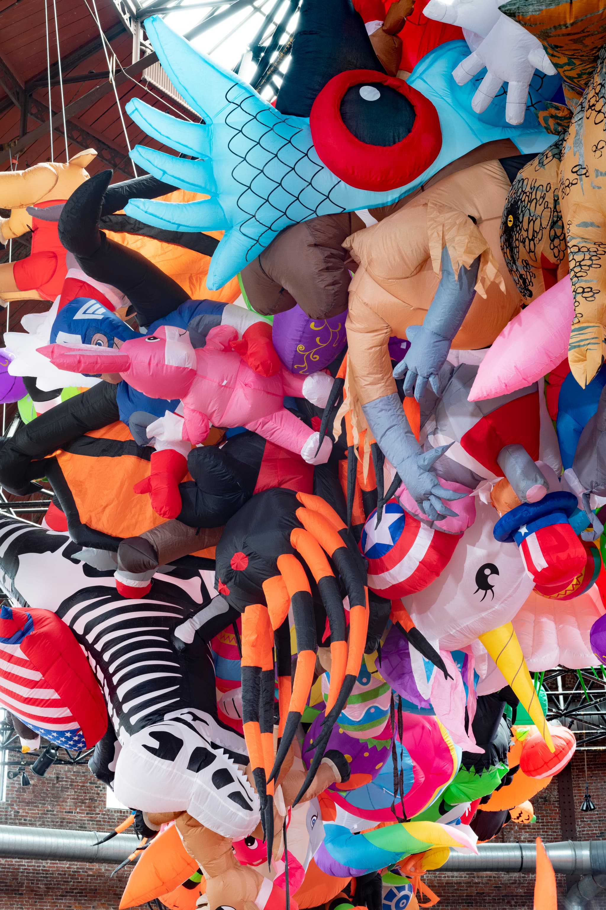 An abundance of colorful, inflatable figures hanging in the Cyclorama.