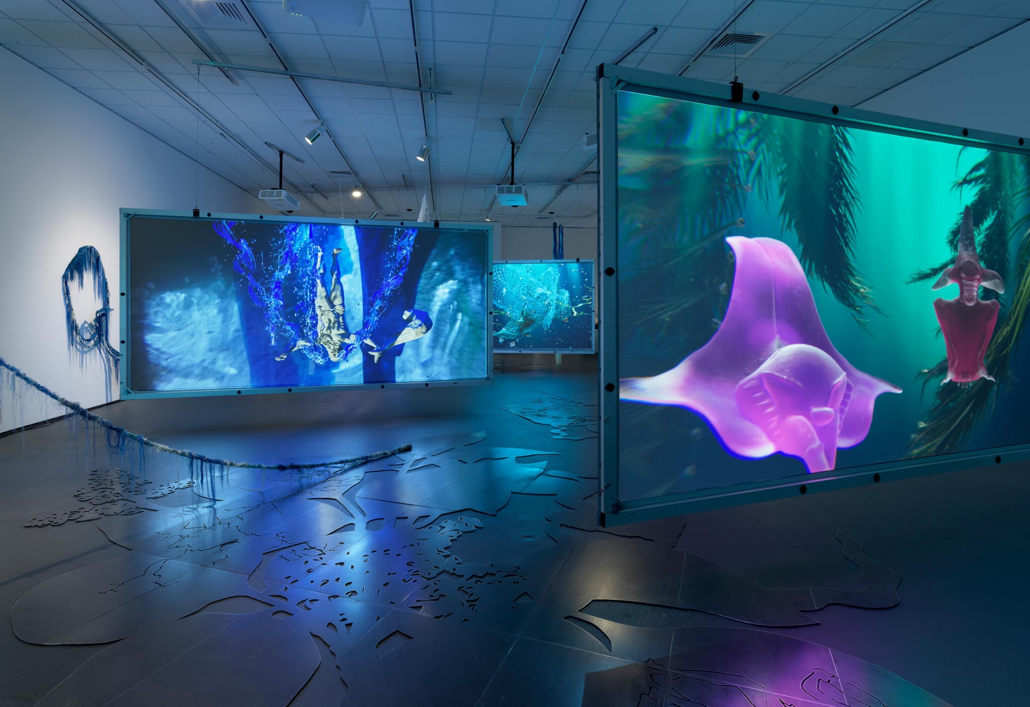 Installation view, “Julien Creuzet: Attila cataract your source at the feet of the green peaks will end up in the great sea blue abyss we drowned in the tidal tears of the moon,” the David Winton Bell Gallery, Brown University, 2025. Photo by Julia Featheringill Photography. Courtesy of the Bell and the artist.