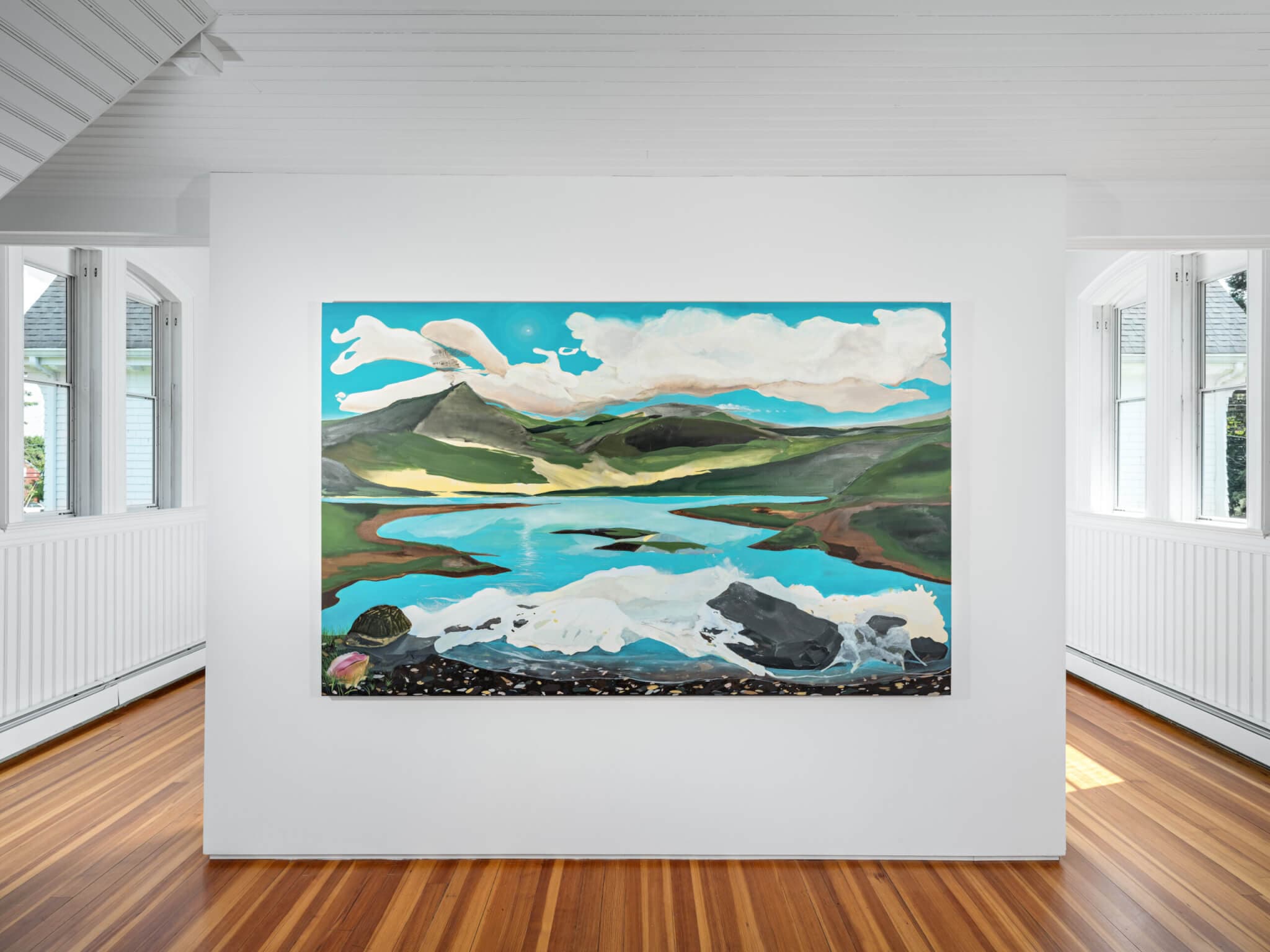 Each of these artists, and so many more, capture the feeling of Maine with its mutable arc of sky, regardless of where they come from, perhaps none more so than DC-born, New York-based Nathaniel Oliver. At a remarkable 60¼″ x 96⅛″, his cloud-heavy vista Over Here (2024) is the first thing you see when you visit the church, taking up the entirety of a floating wall that eclipses the space upon entry. I have seen this landscape—a mountain-ringed cove with waves frothing in the foreground against a thin lip of pebbled beach—many times during my travels up and down the coast, from the shores of Mount Desert Island to the hidden inlets of the midcoast. And yet, when I chatted with Oliver at the exhibition’s opening, he shared that he had been in the state for a total of eighteen hours. “I dreamed this place,” he said, nodding to the painting and showing me progress shots on his phone, a series of layers that he would paint, consider, and respond to, a rock slowly morphing into a turtle in the bottom left corner, the mountains darkening from buttercup yellows into hunter greens and slate grays. “I think you dreamed this place,” I replied, gesturing outside the church’s open door. He turned and grinned into blues and greens and whites of the heavenly Maine afternoon. “I think so too.”