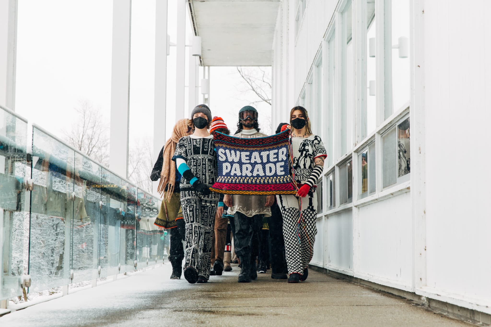 Bennington students donned Auerbach’s work and marched across the college campus in a literal Sweater Parade on March 12, 2022. A film of the parade event is part of the exhibition. Photo by Alexa Curran for Usdan Gallery.