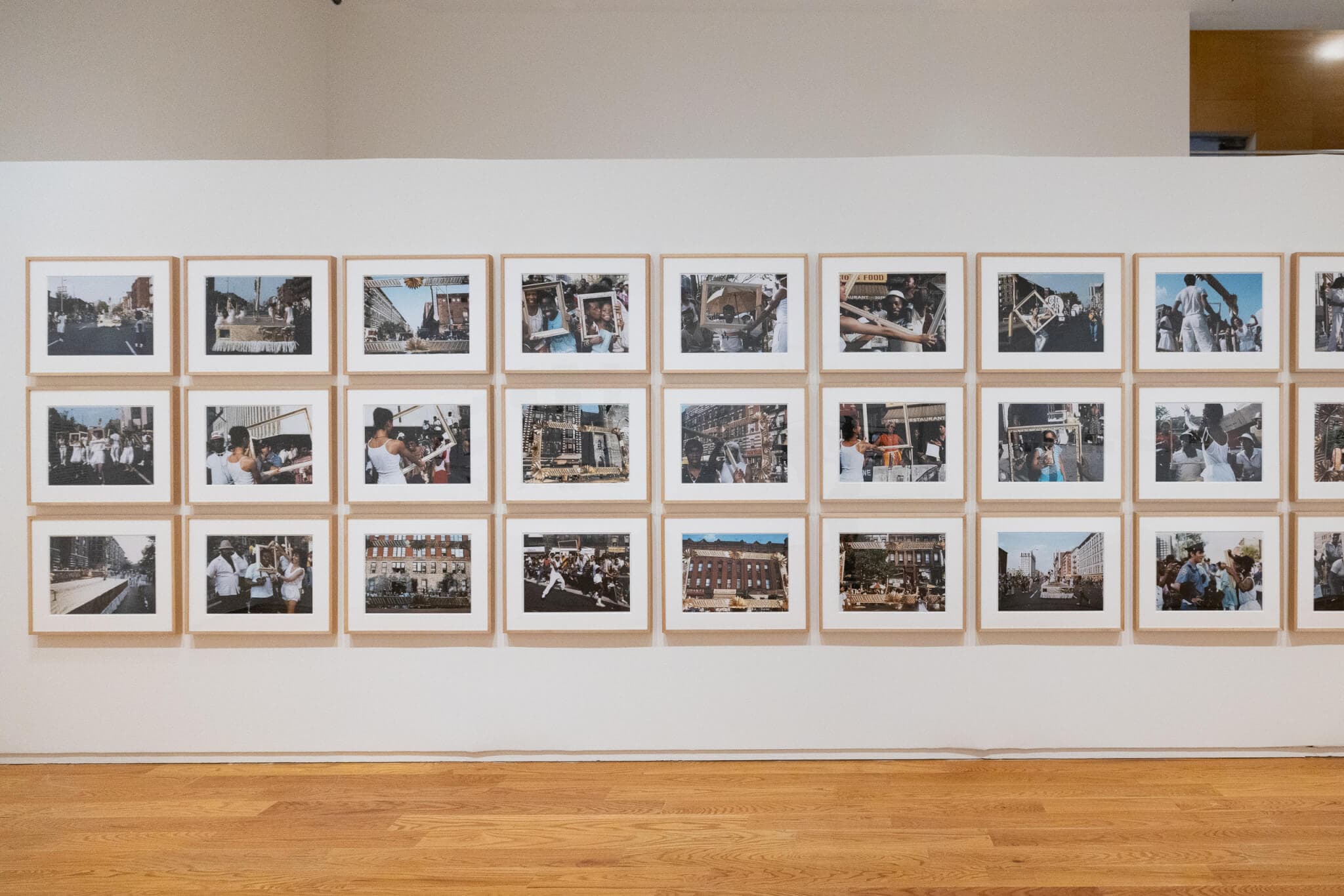 In 1983 she courageously undermined the power of the white-run art world in Art Is. . . Working collaboratively with other artists, including David Hammons, O’Grady created a nine-by-fifteen-foot gold frame atop a gold-skirted float with the words “ART IS . . .” painted in bold black lettering along the side. It rode along Adam Clayton Powell Jr. Boulevard in the vibrant historically Black neighborhood of Harlem framing its street scenes and its people as art during the annual African American Day Parade. Fifteen dancers dressed in all white danced around the float holding more gold frames that they placed the viewing public within, answering their calls—“Frame me, make me art!” One large wall in the gallery displays forty photographs from the performance. A grid of thirty-nine photographs are displayed in landscape orientation, and to their right, the sole vertical shot depicts a young woman beaming toward  the sun and pointing through the gold frame that frames her back at us. This final frame includes a subtly sweet nod to her hometown: in the bottom left corner of the image, a child’s shirt reads “Property of Boston Red Sox.”