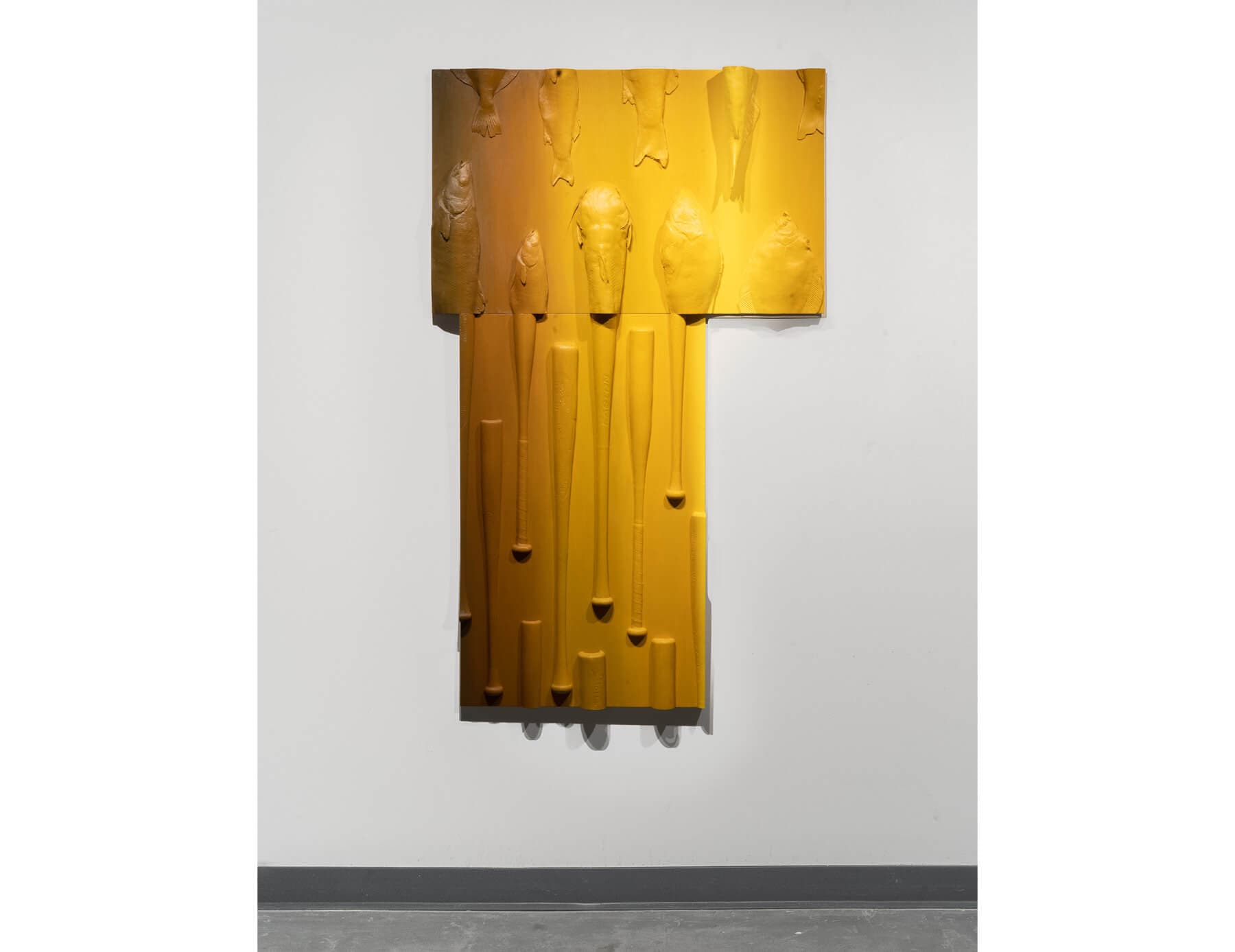 Kim’s sculptural paintings are kind of like looking at a lover’s skin too, in the sense that looking at braids, fish bones, fish, and bats will certainly elicit any number of personal associations, memories, and feelings for viewers. These playful combines from Kim’s Homomorphy series fuse together panels coated with cast forms with similar appearances but arbitrary relationships. The sculptural paintings readily establish the ways in which context, proximity, and placement dictate visual experience: fishbones and braids look and feel different next to each other than either archetype would look alone. The sculptural paintings also bring the fuzziness of culturally enforced binaries to the forefront, such as nature versus artifice, organic versus inorganic, and living versus nonliving. If fish and baseball bats are different, wherein do those differences lie? Textural and evocative upheavals of the taxonomic, the Homomorphy works again ask for an embodied, material understanding of vision.