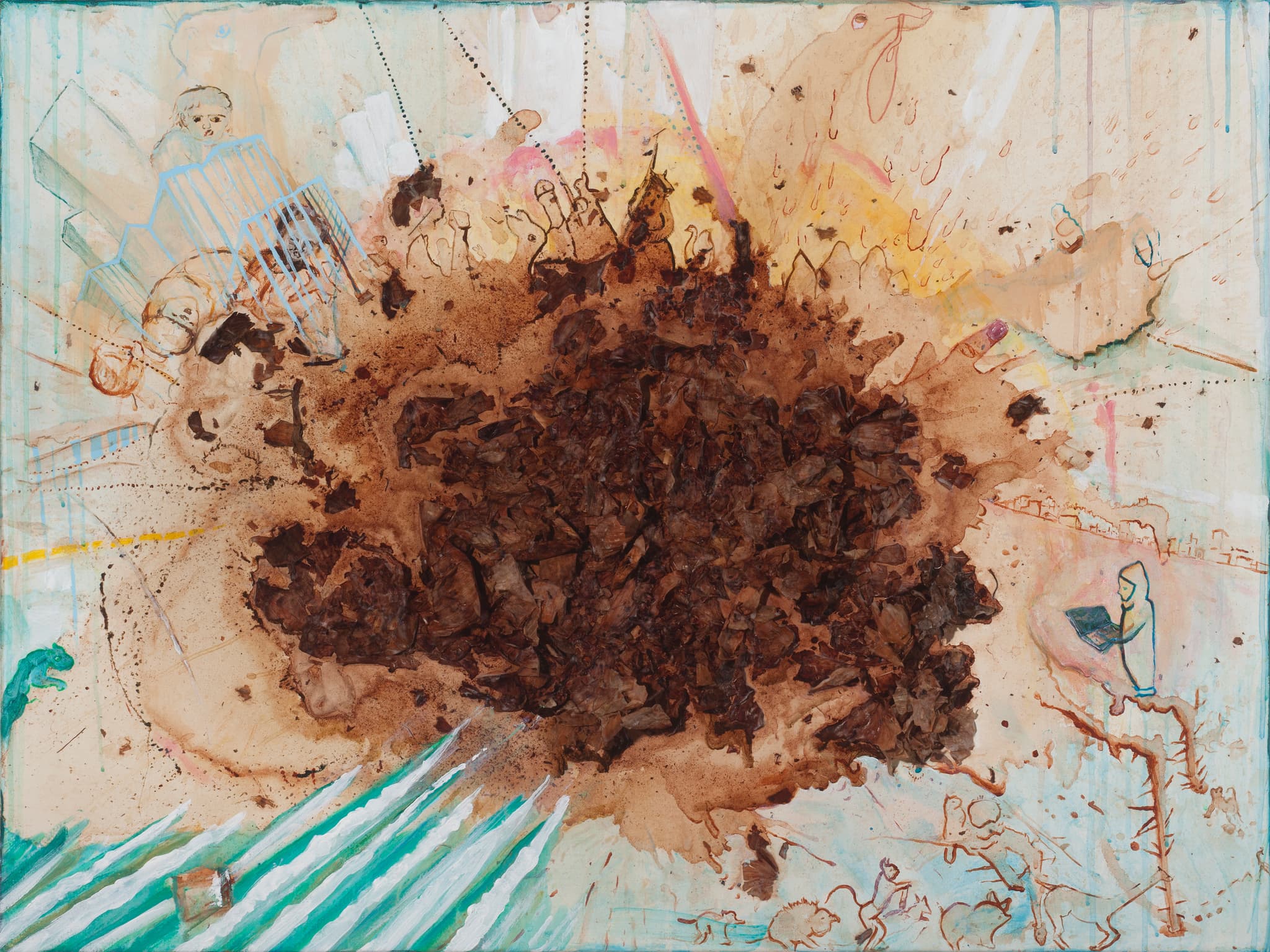 Odabashian’s recent solo exhibition at Galatea Fine Art, entitled “Stir: Drawings and Paintings from the Onion Pot,” and her “21′ Drawing,” part of the 26th iteration of the group drawing show curated by Chanel Thervil at the Mills Gallery at the Boston Center for the Arts, (Field Notes: Lovers, Teachers and the Consciousness In Between), pick up where she left off from “Skins.” The works at Galatea are contained in smaller canvases (under 48”), and this time, the onion skins themselves are the central focus, left on the canvas in all their organic shapes—in turn looking like insect shells or nests, like bird droppings or birds in flight. From the sculptural features, figures emerge on the stained field of the canvas. While progressing through the gallery and encountering these subtle forms—human beings, animals, and hybrid creatures; maps, buildings and cities; breasts and phalluses; foregrounds shifting to background—I felt I was navigating the multi-layered spaces of my own trauma.