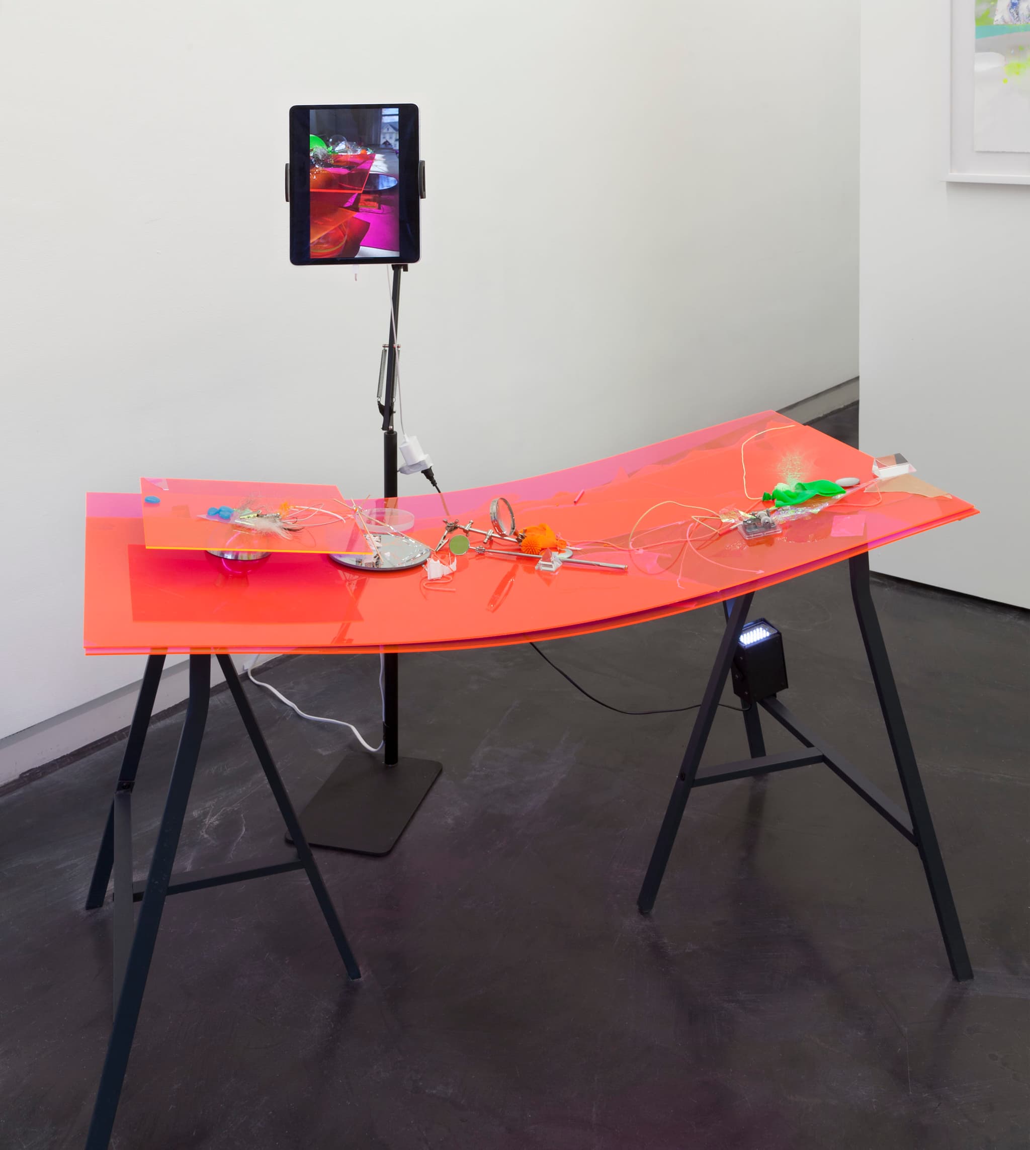 Katherine Mitchell DiRico, i’m always tending, acrylic, latex, string, pop beads, prism, wire, feather, pigment powder, music box, mirror, magnifying glass, light, table legs, 2021. Image by Will Howcroft, courtesy of Praise Shadows Art Gallery.