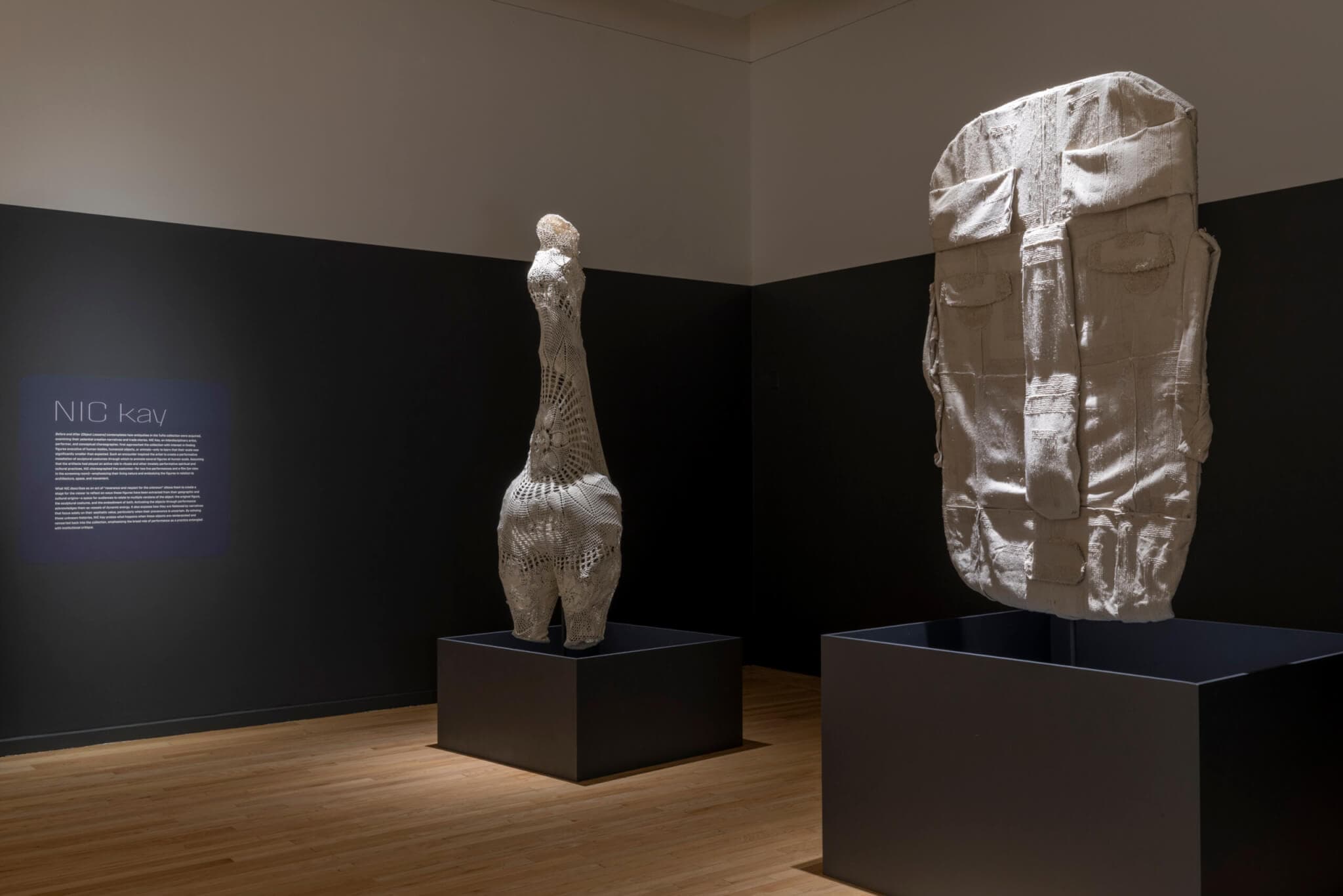 Adjacent to Cherubini’s work is NIC Kay’s Before and After (Object Lesson), 2022. An interdisciplinary artist, performer, and choreographer, Kay chose two archetypal forms, made from the material of the time, a stone Head, Chontal Style (sixth–second century BCE, Mezcala, Chontal) and a terra-cotta Female Figurine (1000–800 BCE, Northwest Iran/Near Eastern), and reimagined them for the present. Kay was struck by how small these artifacts were considering their importance in rituals. The response was to create two larger-than-life imitations, made from today’s impermanent materials that they found at the dollar store, including crocheted blankets and bath mats. Two performances in the exhibition space and a film in the screening room next door seem to activate and animate the figures, giving them a spirit and dignity.