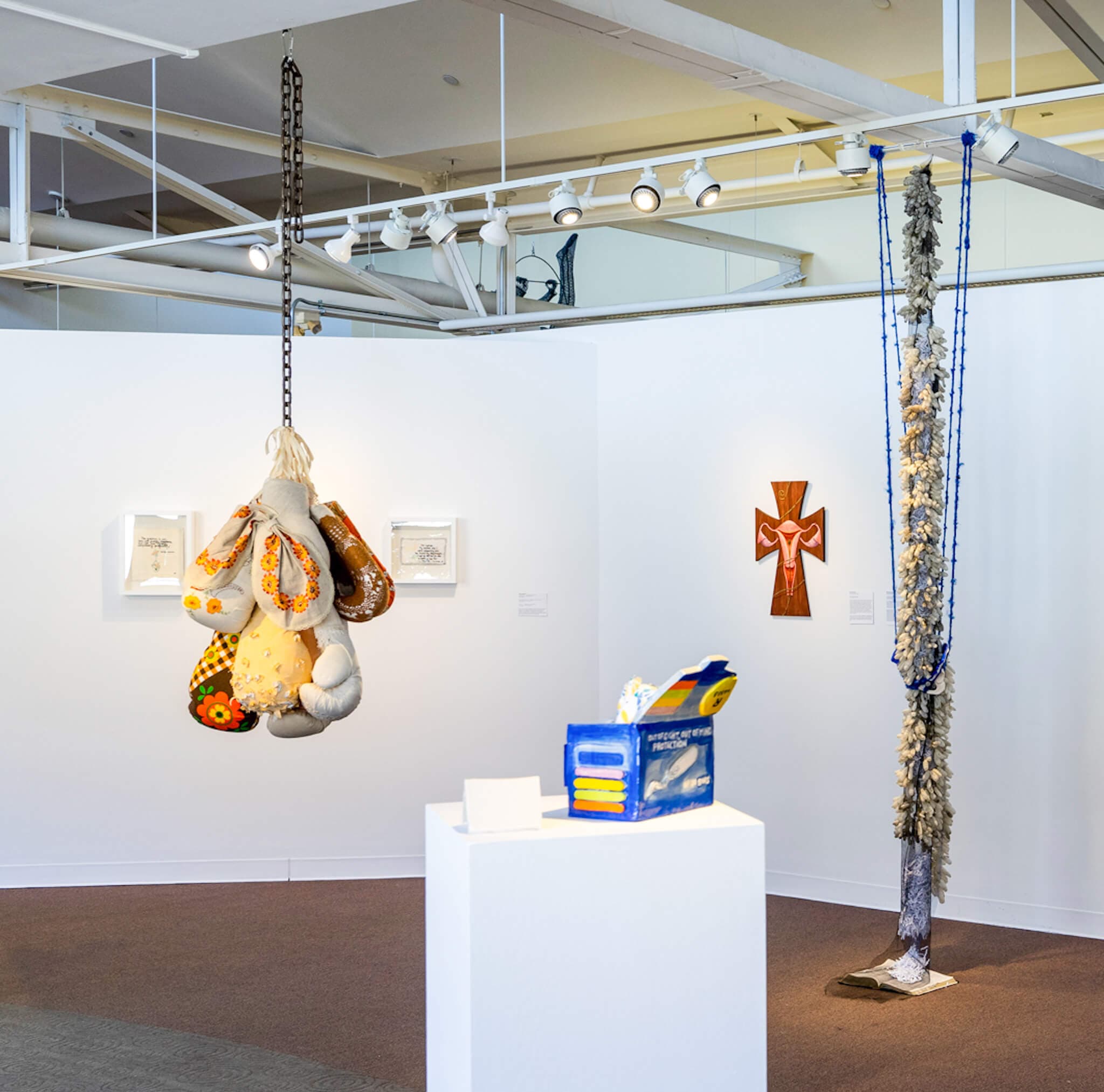 Sculptures linked together by the theme of reproductive justice are suspended from the ceiling.