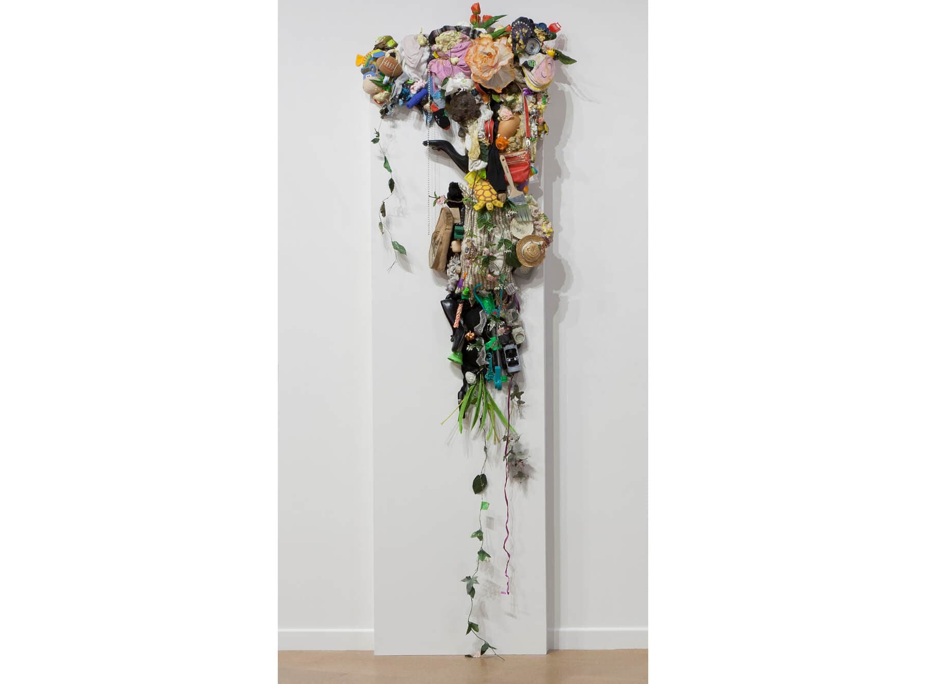 Sarah Meyers Brent, Curious Cultivations, 2020-2023. Repurposed items, mixed media, and wall. 30.5’ x 104’ x 5’. Photo courtesy of Chase Young Gallery.