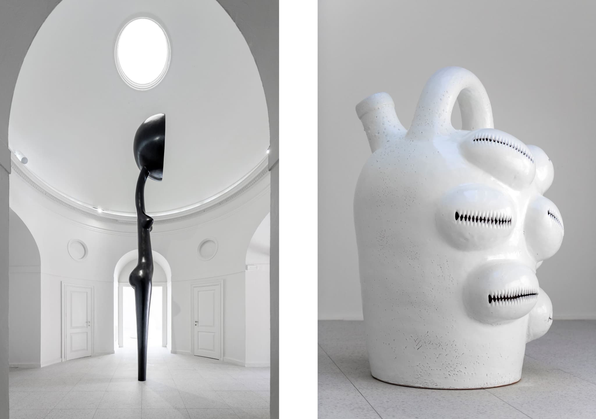 (left) Simone Leigh, Sentinel, 2022. Bronze. 194″ × 39″ × 23.25″. Courtesy the artist and Matthew Marks Gallery. Photo by Timothy Schenck. © Simone Leigh (right) Simone Leigh, Jug, 2022. Glazed stoneware. 62.5″ × 40.75″ × 45.75″. Courtesy the artist and Matthew Marks Gallery. Photo by Timothy Schenck. © Simone Leigh