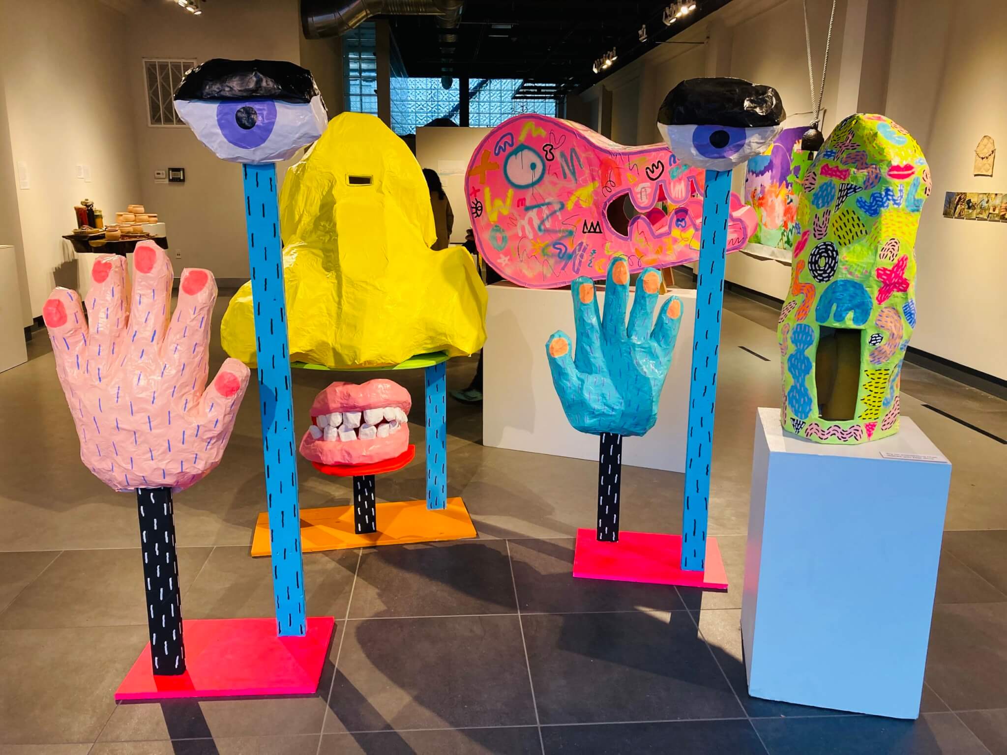 The exhibit called on seven local artists (including me, which is how Sunny and I first met) to make artifacts excavated from a future one hundred years after the fall of capitalism. What Allis came up with was essentially anti-dystopian: huge, neon-colorful wearable sculptures that became a big draw for passersby who saw them through the gallery’s wall-sized picture windows.