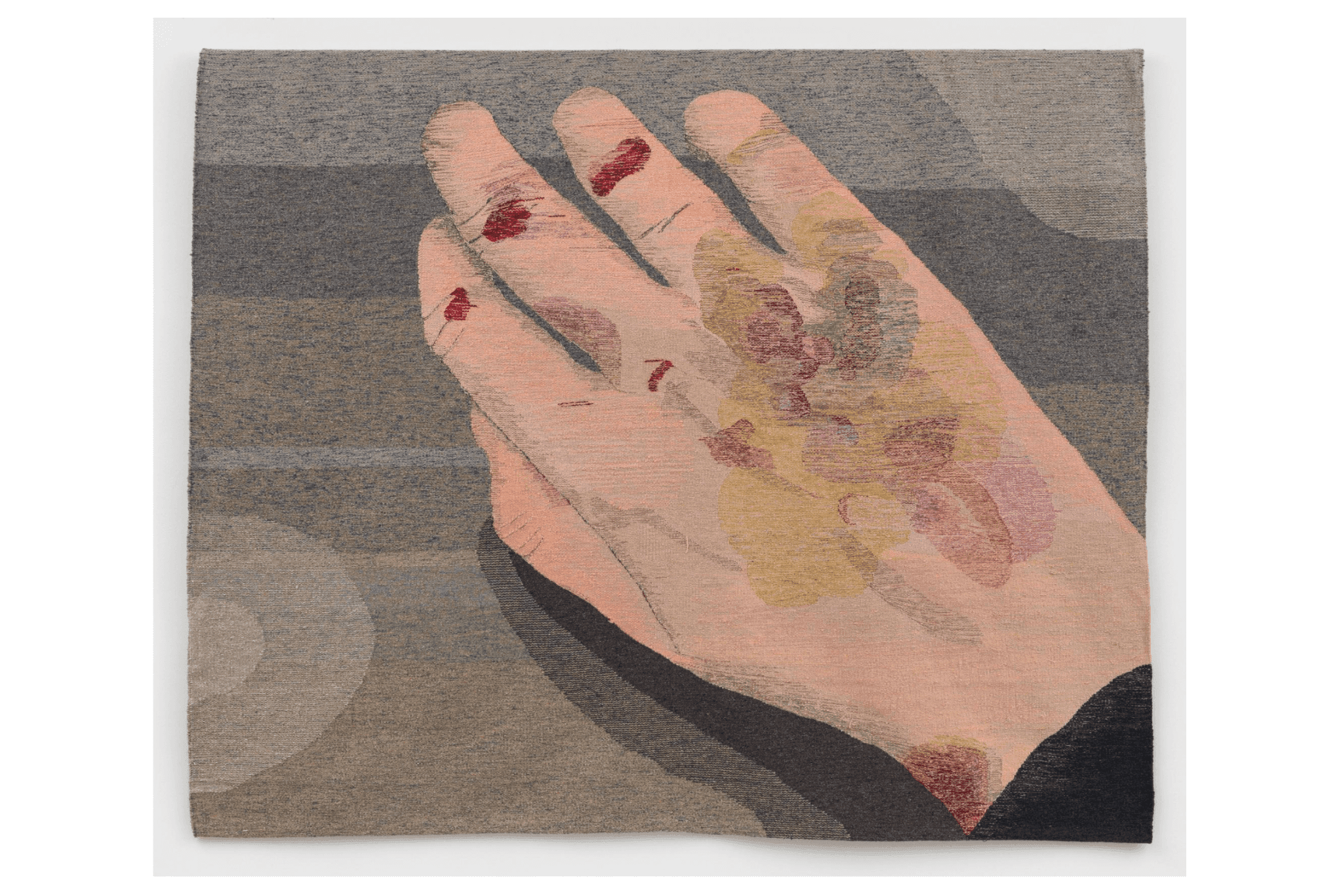 Around the corner, a new theme emerges: “unheard and untold stories” explores the effects of systemic social oppression more explicitly. On the far end of the space hangs a tapestry by Erin M. Riley showing a bruised and cut hand. Nearby hangs a clock stopped at the exact time of the Hiroshima bombing; around the edge of the clock, artist Mimi Smith has painted the words “time heals nothing.” Along the gallery’s longest wall hang a series of televisions showing videos by various artists, which viewers can watch from the comfort of the diner booths placed in front of each screen. In one, Kittens Grow Up (2007), experimental filmmaker Luther Price intercuts found footage of cuddling kittens with footage of a working-class family experiencing various crises: alcoholism, financial stress, neglect. The contrast is meant to shake the viewer out of complacency, to remind us that the struggles of the family on screen, however prevalent in our culture, are in fact profoundly unnatural, abnormal.