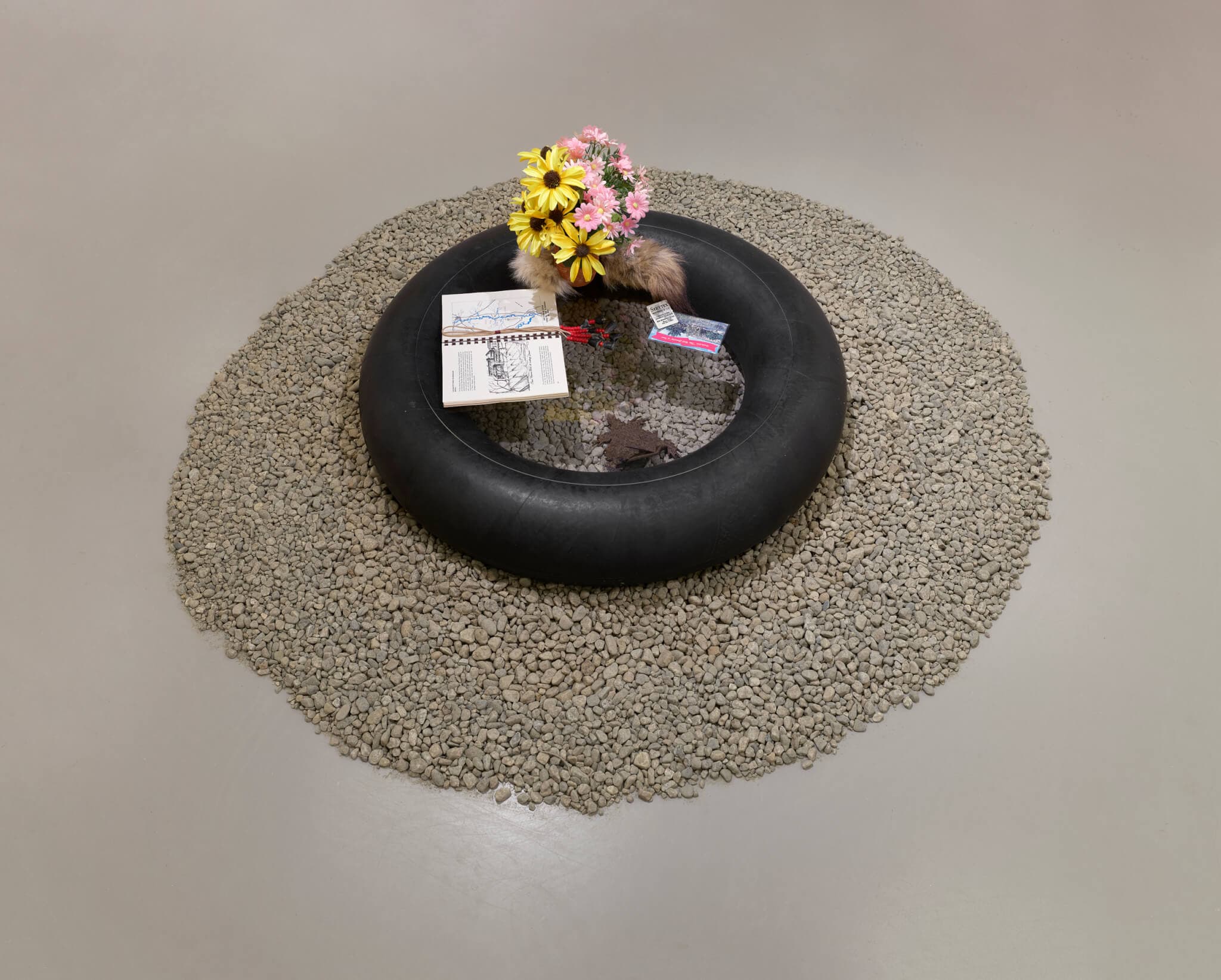 Place as Practice Research Collective, Inner Tube Vitrine II, 2024. “The place where the creek goes underground,” installation view, on view in the Johnson-Kulukundis Family Gallery, Harvard Radcliffe Institute, through December 14, 2024. Photo by Julia Featheringill. Courtesy of the artists and Harvard Radcliffe Institute.