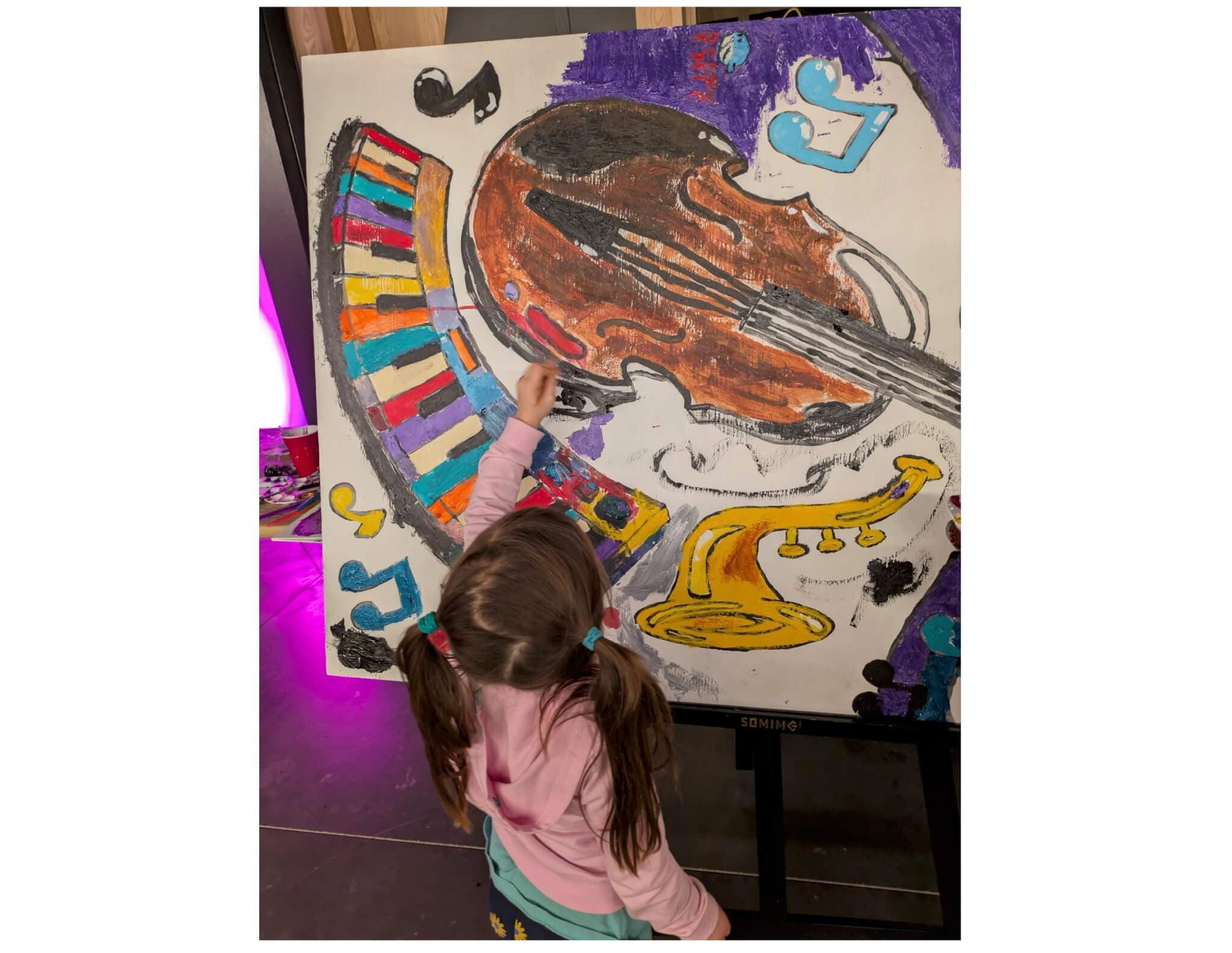 At 8:05 p.m. on a Friday night in November, the Foundry in Cambridge was bustling. The scent of freshly baked banana bread wafted through the lofted space. A ten-year-old and her parents quietly shaped bowls out of clay. A cluster of kids and grown-ups mixed colors and dabbed paint onto a large canvas, which had been outfitted with the outline of a cello.