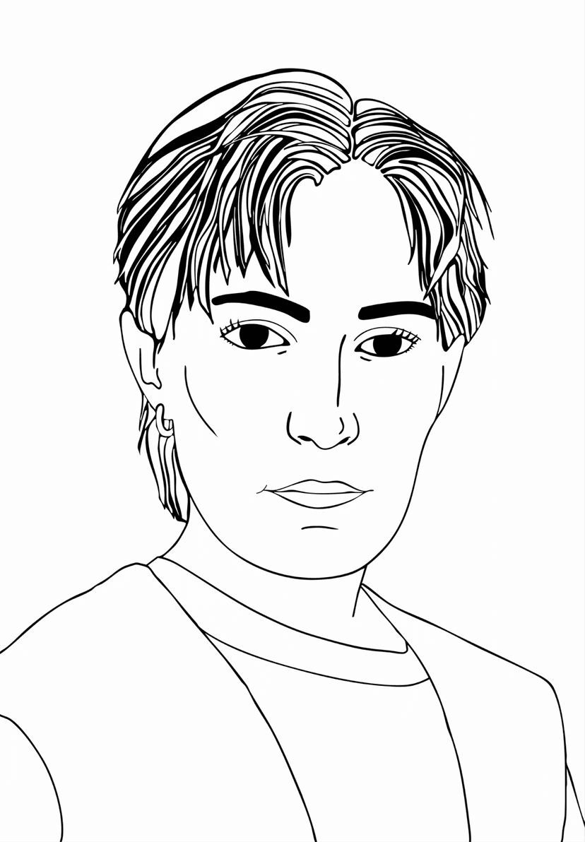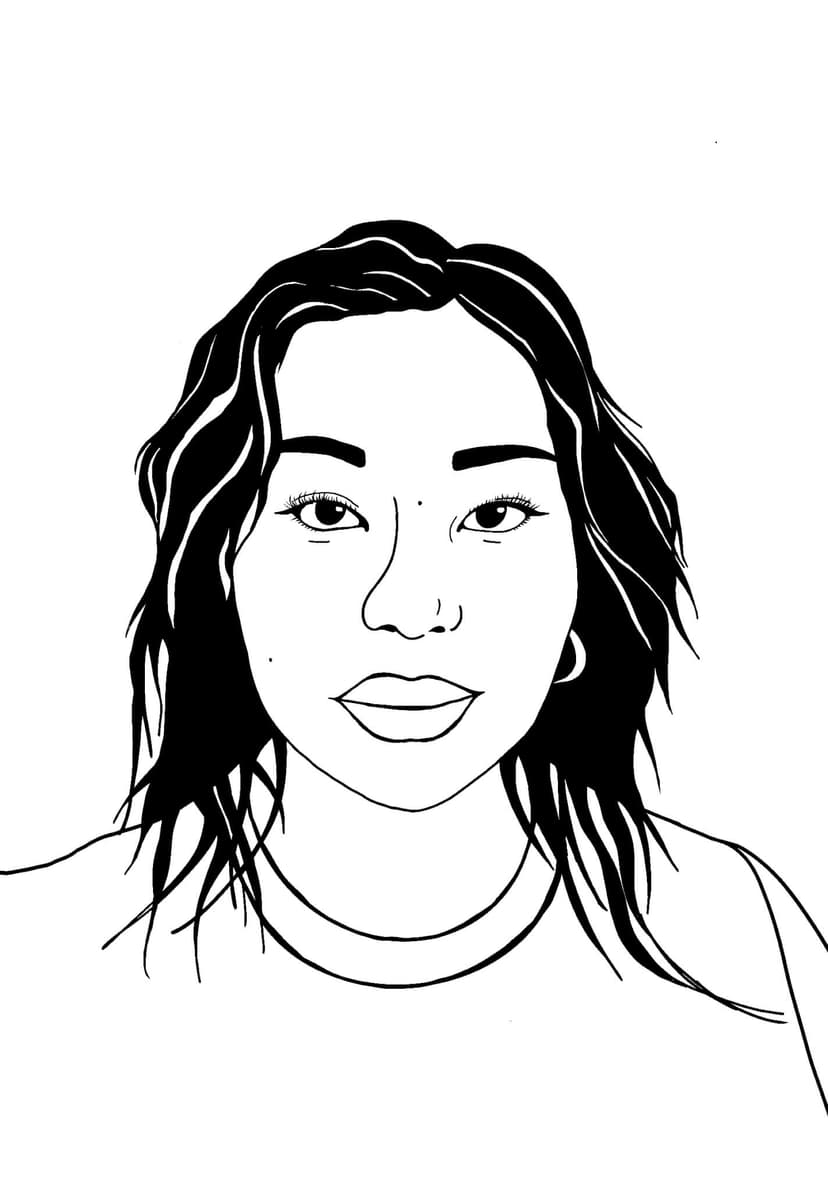 A black and white drawing of Victoria Wong smiling, with her head tilted to the left. Her hair is partly made into a bun and she's wearing hoop earrings.