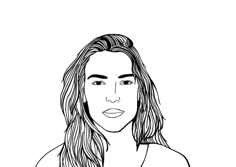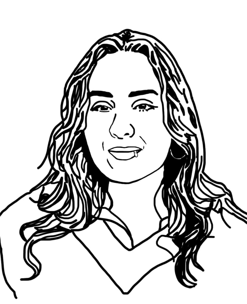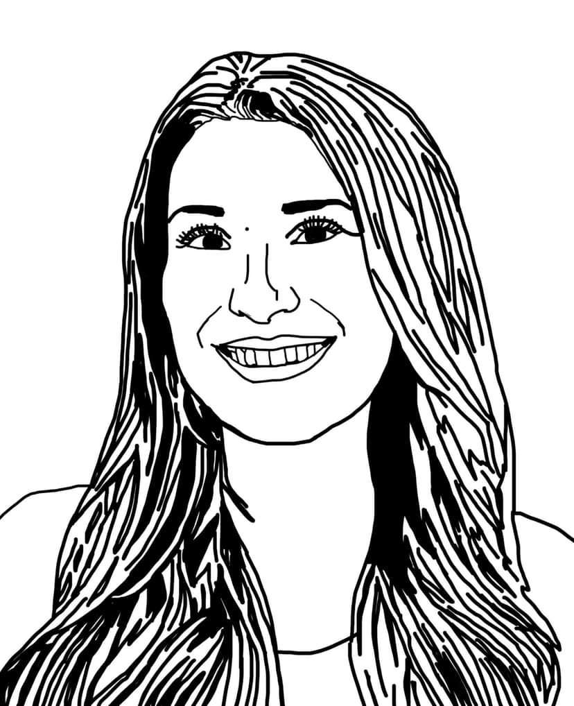 A black and white drawing of Jessica Shearer, a woman with a bob, smiling at the viewer with her head slightly turned left.