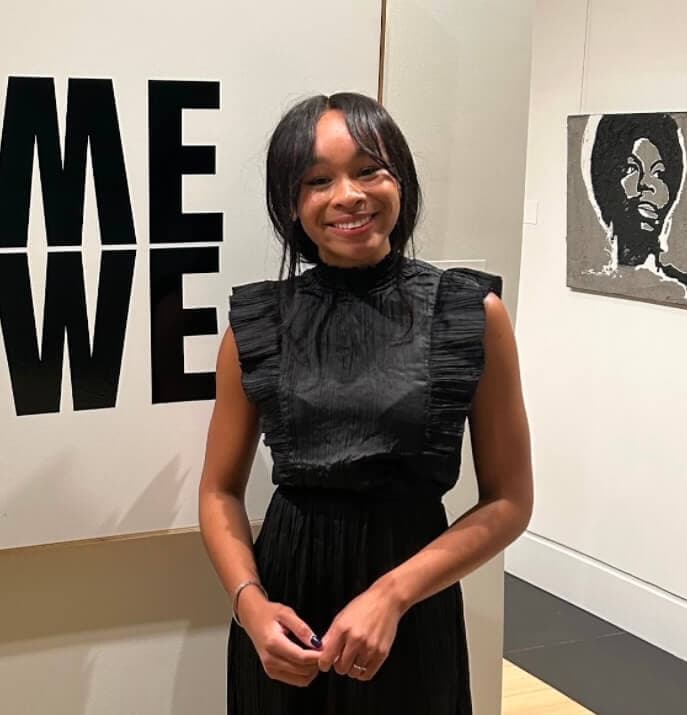 A black and white drawing of Alisa V. Prince smiling at the viewer. She sports a parted afro and circular earrings.