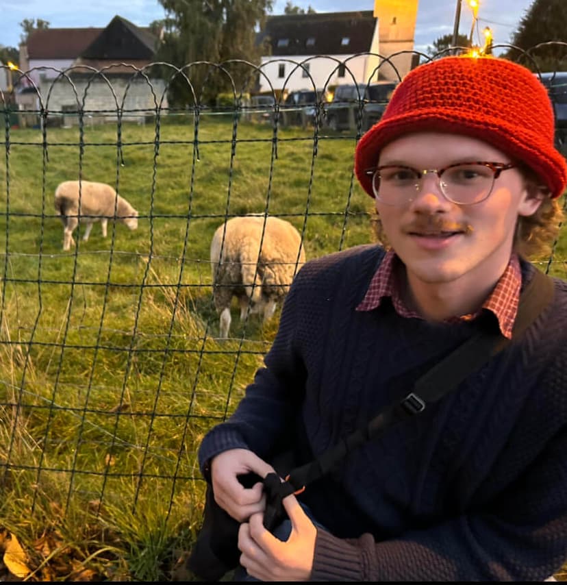 A black and white drawing of Jacqueline Houton smiling at the viewer in a three-quarter profile towards the right. She's wearing eyeglasses, and has bangs with long hair.